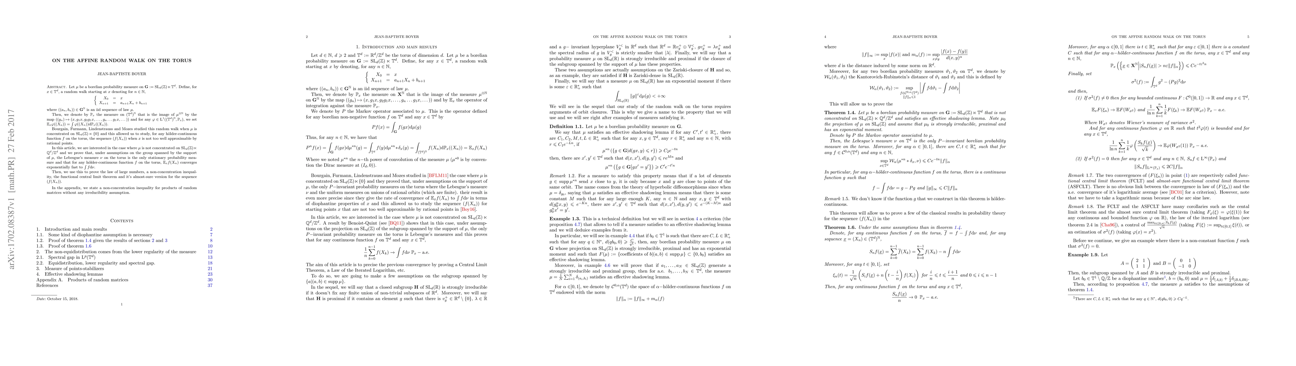 Let $\mu$ be a borelian probability measure on $\mathbf{G}:=\mathrm{SL}_d(\mathbb{Z}) \ltimes \mathbb{T}^d$. Define, for $x\in \mathbb{T}^d$, a random walk starting at $x$ denoting for $n\in \mathbb{N}$, \[ \left\{\begin{array}{rcl} X_0 &=&x\\ X_{n+1} &=& a_{n+1} X_n + b_{n+1} \end{array}\right. \] where $((a_n,b_n))\in \mathbf{G}^\mathbb{N}$ is an iid sequence of law $\mu$. Then, we denote by $\mathbb{P}_x$ the measure on $(\mathbb{T}^d)^\mathbb{N}$ that is the image of $\mu^{\otimes \mathbb{N}}$ by the map $\left((g_n) \mapsto (x,g_1 x, g_2 g_1 x, \dots , g_n \dots g_1 x, \dots)\right)$ and for any $\varphi \in \mathrm{L}^1((\mathbb{T}^d)^\mathbb{N}, \mathbb{P}_x)$, we set $\mathbb{E}_x \varphi((X_n)) = \int \varphi((X_n)) \mathrm{d}\mathbb{P}_x((X_n))$. Bourgain, Furmann, Lindenstrauss and Mozes studied this random walk when $\mu$ is concentrated on $\mathrm{SL}_d(\mathbb{Z}) \ltimes\{0\}$ and this allowed us to study, for any h\"older-continuous function $f$ on the torus, the sequence $(f(X_n))$ when $x$ is not too well approximable by rational points. In this article, we are interested in the case where $\mu$ is not concentrated on $\mathrm{SL}_d(\mathbb{Z}) \ltimes \mathbb{Q}^d/\mathbb{Z}^d$ and we prove that, under assumptions on the group spanned by the support of $\mu$, the Lebesgue's measure $\nu$ on the torus is the only stationary probability measure and that for any h\"older-continuous function $f$ on the torus, $\mathbb{E}_x f(X_n)$ converges exponentially fast to $\int f\mathrm{d}\nu$. Then, we use this to prove the law of large numbers, a non-concentration inequality, the functional central limit theorem and it's almost-sure version for the sequence $(f(X_n))$. In the appendix, we state a non-concentration inequality for products of random matrices without any irreducibility assumption.