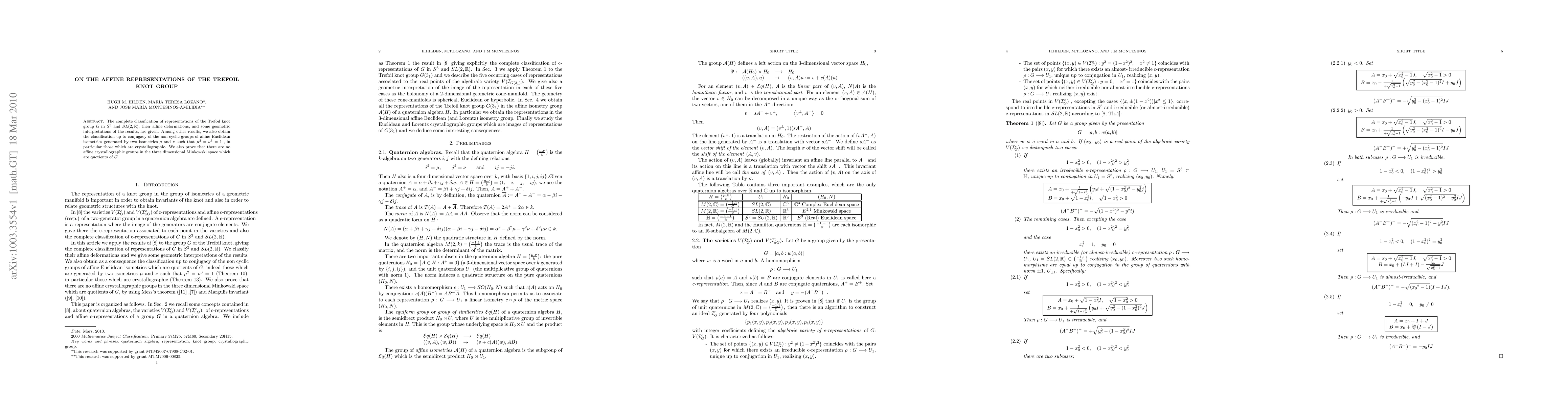 The complete classification of representations of the Trefoil knot group G in S^{3} and SL(2,R), their affine deformations, and some geometric interpretations of the results, are given. Among other results, we also obtain the classification up to conjugacy of the non cyclic groups of affine Euclidean isometries generated by two isometries $\mu$ and $\nu$ such that $\mu^{2}=\nu^{3}=1$, in particular those which are crystallographic. We also prove that there are no affine crystallographic groups in the three dimensional Minkowski space which are quotients of G.