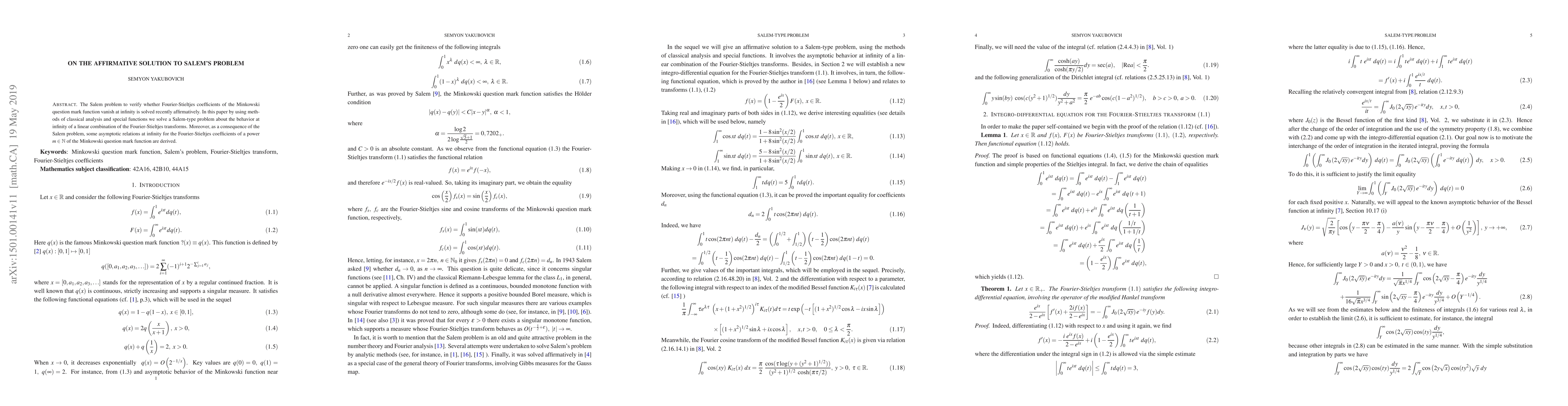 The Salem problem to verify whether Fourier-Stieltjes coefficients of the Minkowski question mark function vanish at infinity is solved recently affirmatively. In this paper by using methods of classical analysis and special functions we solve a Salem-type problem about the behavior at infinity of a linear combination of the Fourier-Stieltjes transforms. Moreover, as a consequence of the Salem problem, some asymptotic relations at infinity for the Fourier-Stieltjes coefficients of a power $m\in \mathbb{N}$ of the Minkowski question mark function are derived.