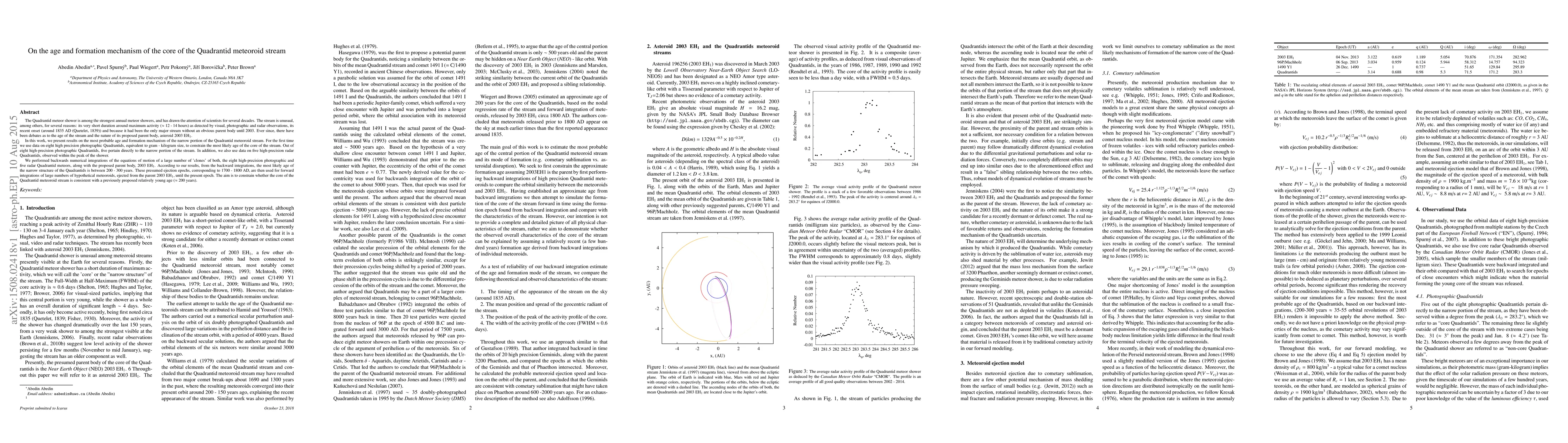 This paper investigates the age and formation mechanism of the Quadrantid meteoroid stream, finding that the narrow core of the stream is likely between 200-300 years old, based on high-precision photographic and radar data, and backward numerical integrations of the stream's meteoroids. The results support a relatively young age for the stream's core, consistent with ejections from the proposed parent body, asteroid 2003 EH1, around 1700-1800 AD.