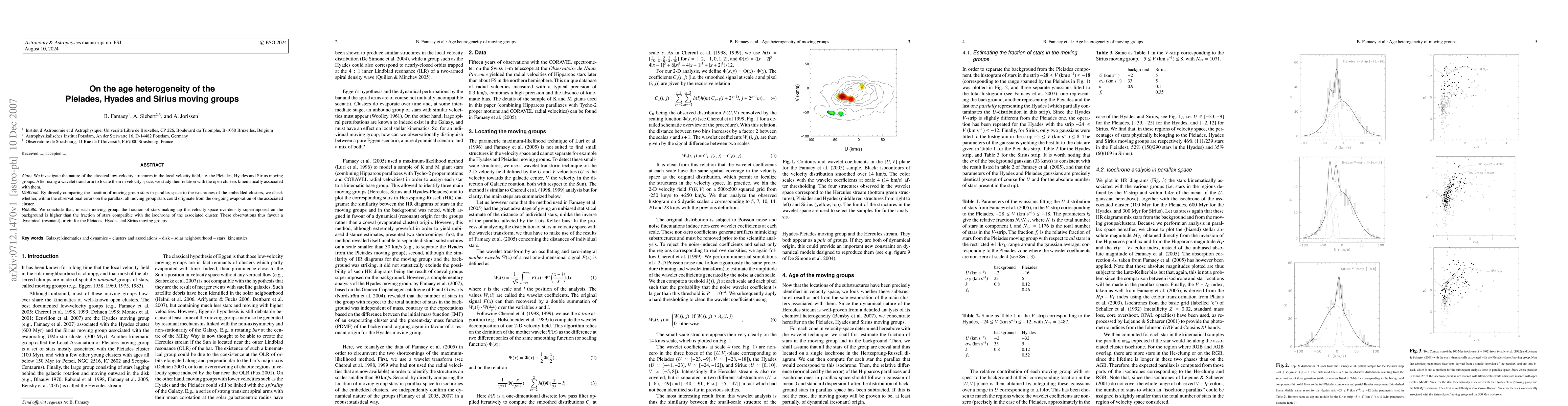 This paper investigates the age heterogeneity of the Pleiades, Hyades, and Sirius moving groups using a wavelet transform to analyze their velocity space and kinematic associations with open clusters. The study finds that the stars in these moving groups are more dispersed than the stars compatible with the clusters' isochrones, suggesting a dynamical origin rather than simple evaporation from the clusters.
