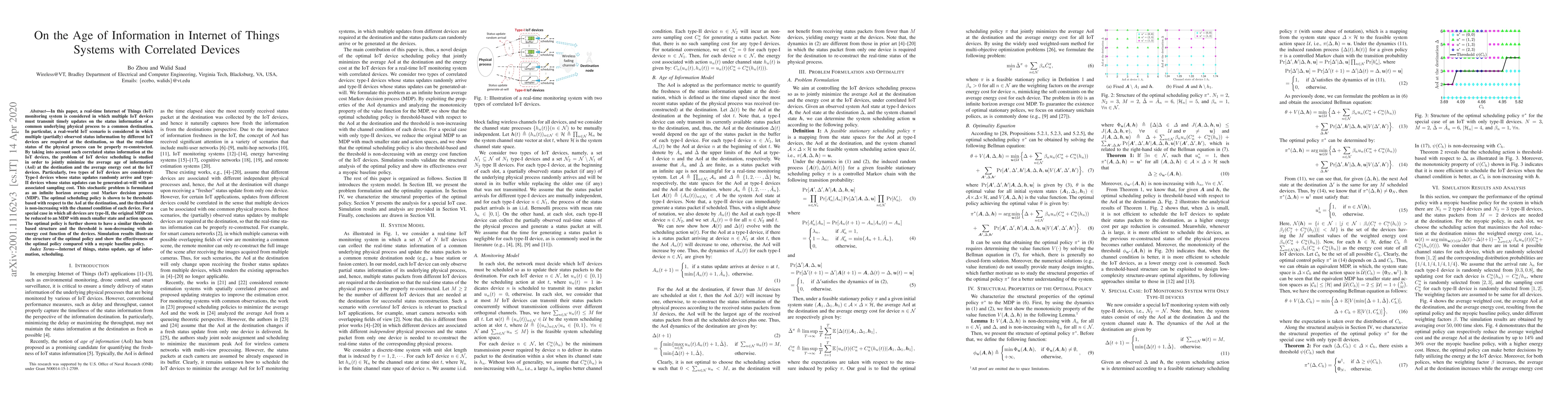 In this paper, a real-time Internet of Things (IoT) monitoring system is considered in which multiple IoT devices must transmit timely updates on the status information of a common underlying physical process to a common destination. In particular, a real-world IoT scenario is considered in which multiple (partially) observed status information by different IoT devices are required at the destination, so that the real-time status of the physical process can be properly re-constructed. By taking into account such correlated status information at the IoT devices, the problem of IoT device scheduling is studied in order to jointly minimize the average age of information (AoI) at the destination and the average energy cost at the IoT devices. Particularly, two types of IoT devices are considered: Type-I devices whose status updates randomly arrive and type-II devices whose status updates can be generated-at-will with an associated sampling cost. This stochastic problem is formulated as an infinite horizon average cost Markov decision process (MDP). The optimal scheduling policy is shown to be threshold-based with respect to the AoI at the destination, and the threshold is non-increasing with the channel condition of each device. For a special case in which all devices are type-II, the original MDP can be reduced to an MDP with much smaller state and action spaces. The optimal policy is further shown to have a similar threshold-based structure and the threshold is non-decreasing with an energy cost function of the devices. Simulation results illustrate the structure of the optimal policy and show the effectiveness of the optimal policy compared with a myopic baseline policy.