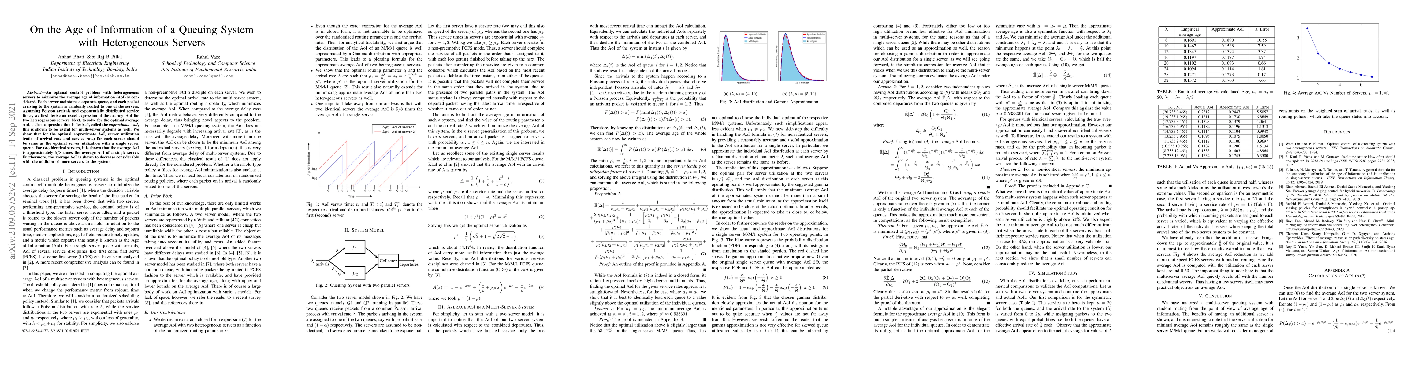 An optimal control problem with heterogeneous servers to minimize the average age of information (AoI) is considered. Each server maintains a separate queue, and each packet arriving to the system is randomly routed to one of the servers. Assuming Poisson arrivals and exponentially distributed service times, we first derive an exact expression of the average AoI for two heterogeneous servers. Next, to solve for the optimal average AoI, a close approximation is derived, called the approximate AoI, this is shown to be useful for multi-server systems as well. We show that for the optimal approximate AoI, server utilization (ratio of arrival rate and service rate) for each server should be same as the optimal server utilization with a single server queue. For two identical servers, it is shown that the average AoI is approximately 5/8 times the average AoI of a single server. Furthermore, the average AoI is shown to decrease considerably with the addition of more servers to the system.
