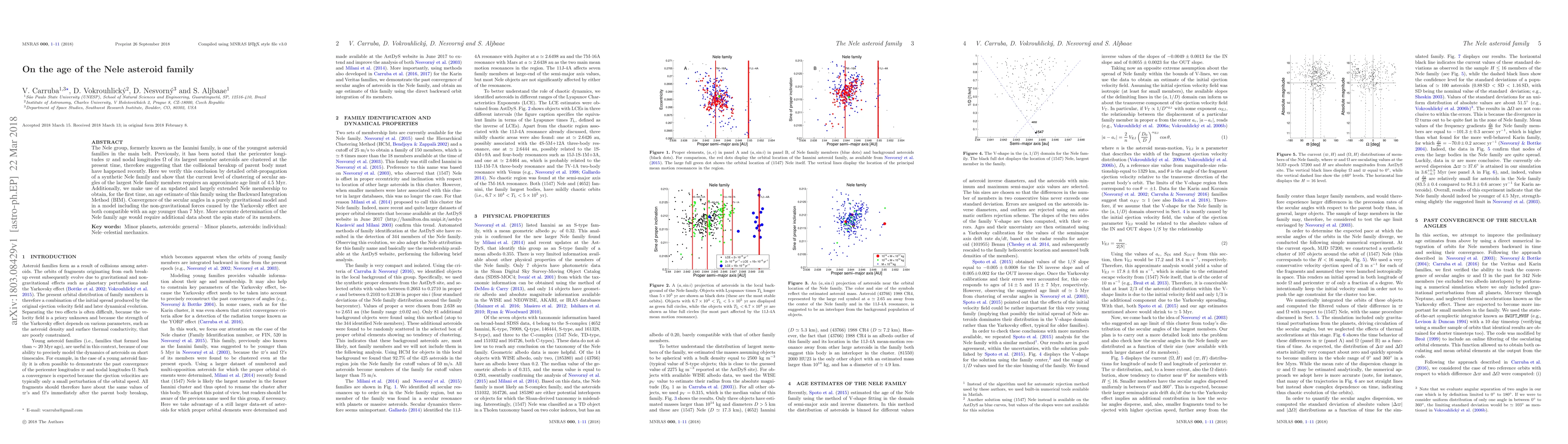 The Nele group, formerly known as the Iannini family, is one of the youngest asteroid families in the main belt. Previously, it has been noted that the pericenter longitudes $\varpi$ and nodal longitudes $\Omega$ of its largest member asteroids are clustered at the present time, therefore suggesting that the collisional breakup of parent body must have happened recently. Here we verify this conclusion by detailed orbit-propagation of a synthetic Nele family and show that the current level of clustering of secular angles of the largest Nele family members requires an approximate age limit of $4.5$ Myr. Additionally, we make use of an updated and largely extended Nele membership to obtain, for the first time, an age estimate of this family using the Backward Integration Method (BIM). Convergence of the secular angles in a purely gravitational model and in a model including the non-gravitational forces caused by the Yarkovsky effect are both compatible with an age younger than $7$ Myr. More accurate determination of the Nele family age would require additional data about the spin state of its members.