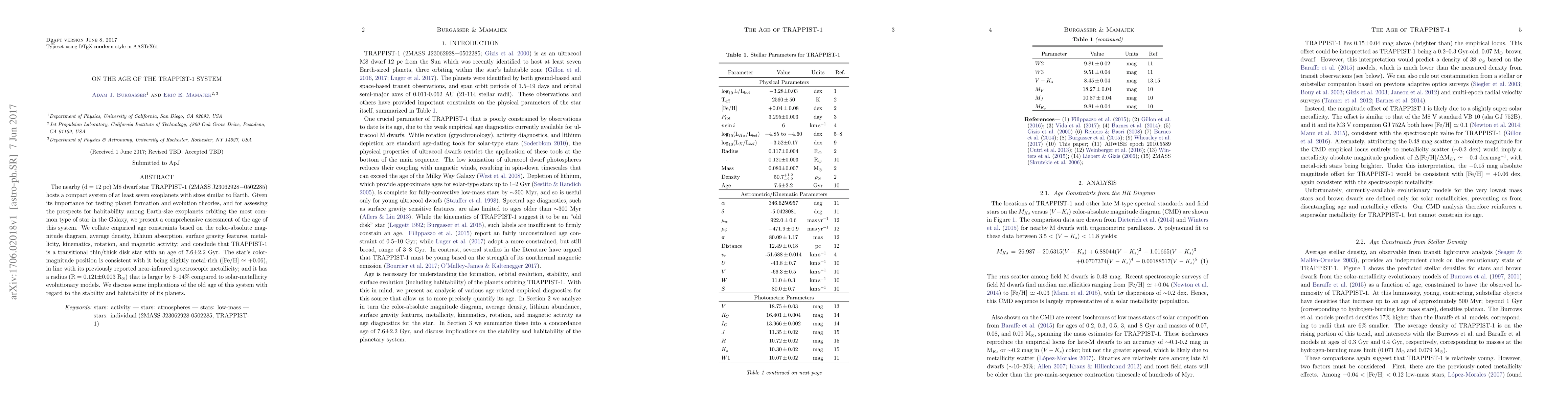 The TRAPPIST-1 system, hosting at least seven Earth-sized exoplanets, is estimated to be 7.6 ± 2.2 Gyr old, based on various empirical age indicators. This old age suggests implications for the stability and potential habitability of its planets.