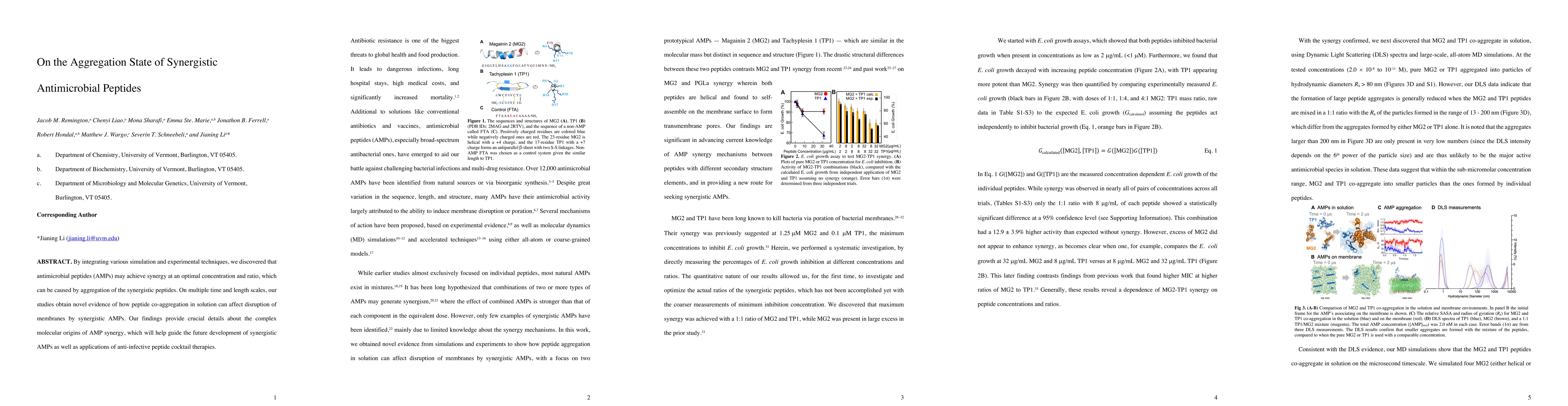 This study reveals that synergistic antimicrobial peptides (AMPs) achieve optimal effectiveness through aggregation at specific concentrations and ratios, which enhances membrane disruption. The research combines simulations and experiments to uncover the molecular mechanisms underlying AMP synergy, offering insights for future AMP cocktail therapies.