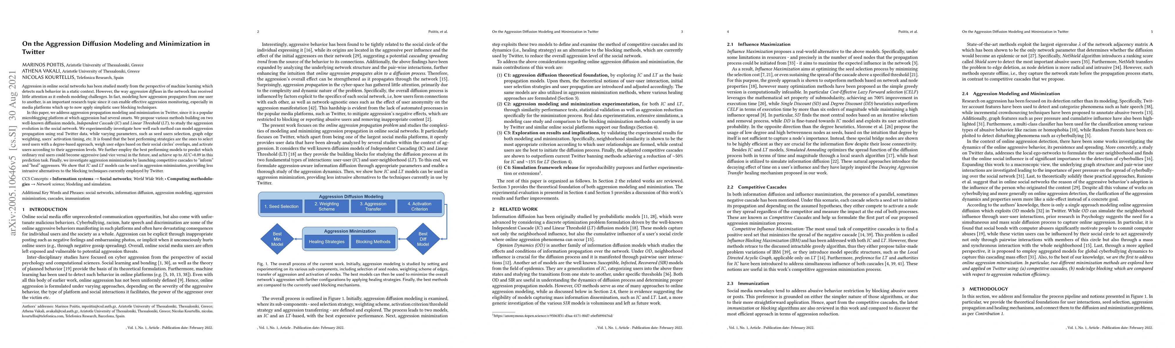 This paper proposes methods to model and minimize aggression diffusion in Twitter using Independent Cascade and Linear Threshold models. It finds that degree-based seed selection, edge weighting by social circle overlaps, and user activation timing based on aggression levels are effective. The study also demonstrates the potential of these models to predict future aggression and minimize it through competitive cascades, offering less intrusive alternatives to current blocking techniques.