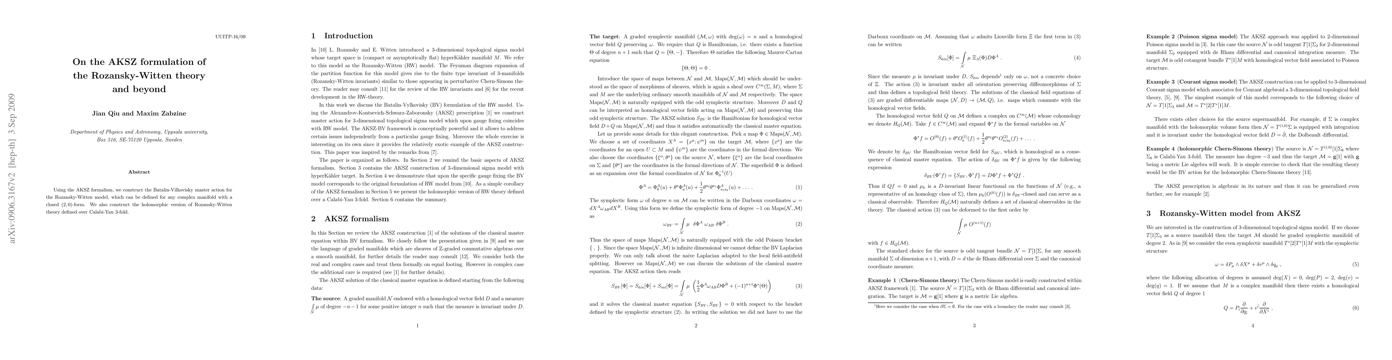 This paper constructs the Batalin-Vilkovisky master action for the Rozansky-Witten model using the AKSZ formalism, applicable to any complex manifold with a closed (2,0)-form, and extends it to a holomorphic version over Calabi-Yau 3-folds.