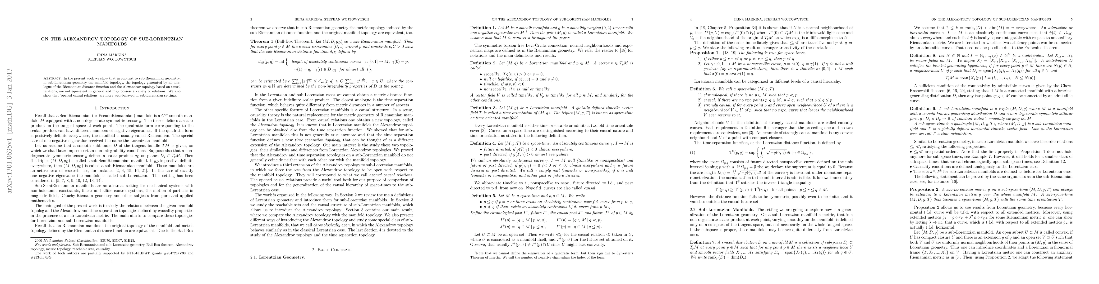 It is commonly known that in Riemannian and sub-Riemannian Geometry, the metric tensor on a manifold defines a distance function. In Lorentzian Geometry, instead of a distance function it provides causal relations and the Lorentzian time-separation function. Both lead to the definition of the Alexandrov topology, which is linked to the property of strong causality of a space-time. We studied three possible ways to define the Alexandrov topology on sub-Lorentzian manifolds, which usually give different topologies, but agree in the Lorentzian case. We investigated their relationships to each other and the manifold's original topology and their link to causality.
