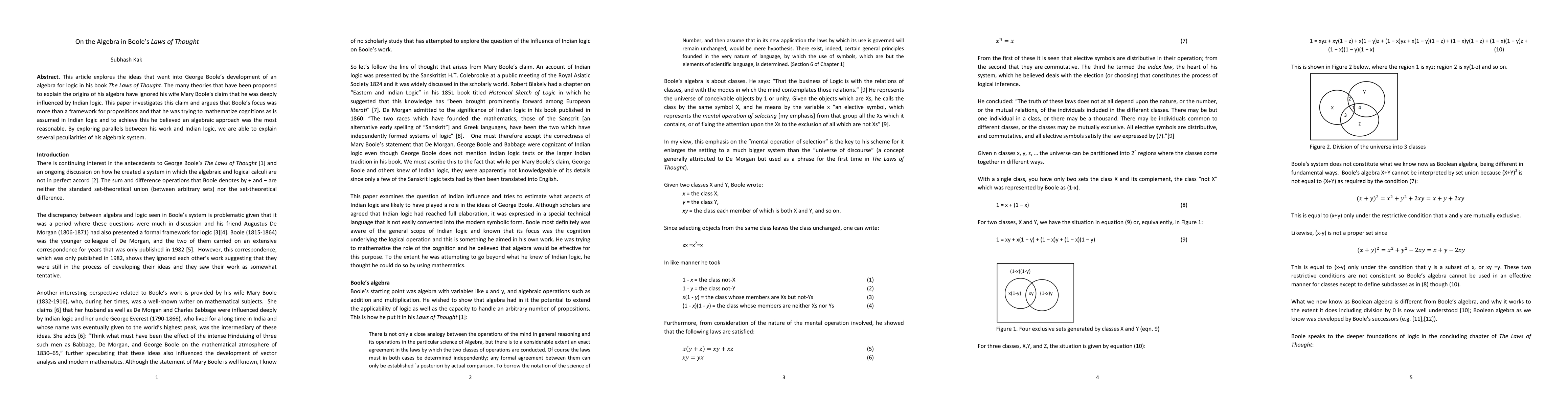 This article explores the ideas that went into George Boole's development of an algebra for logical inference in his book The Laws of Thought. We explore in particular his wife Mary Boole's claim that he was deeply influenced by Indian logic and argue that his work was more than a framework for processing propositions. By exploring parallels between his work and Indian logic, we are able to explain several peculiarities of this work.
