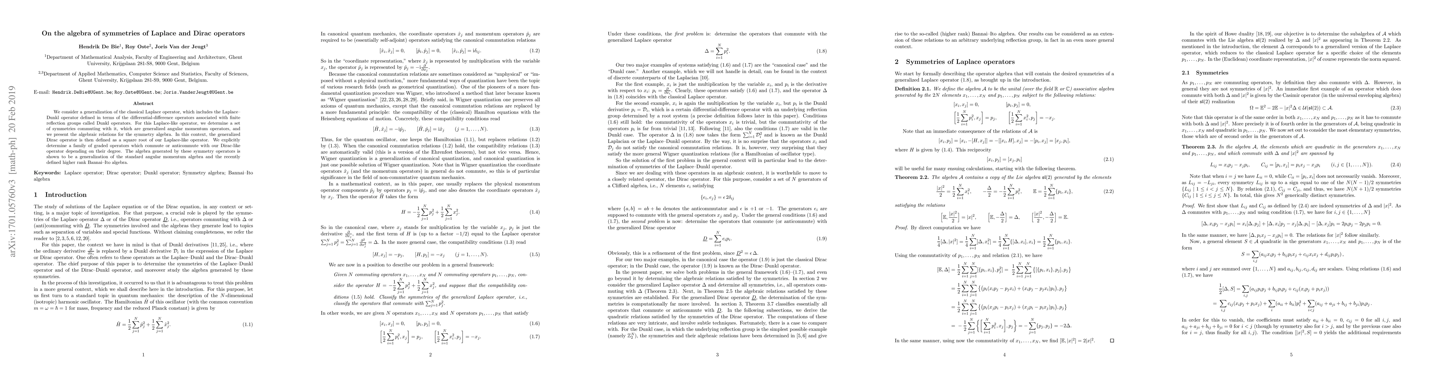 This paper generalizes the Laplace operator to include the Laplace-Dunkl operator, identifying a set of commuting symmetry operators akin to generalized angular momentum. It defines a generalized Dirac operator as a square root of the Laplace-Dunkl operator and explores the algebra of symmetry operators, showing it extends the standard angular momentum algebra and the Bannai-Ito algebra.