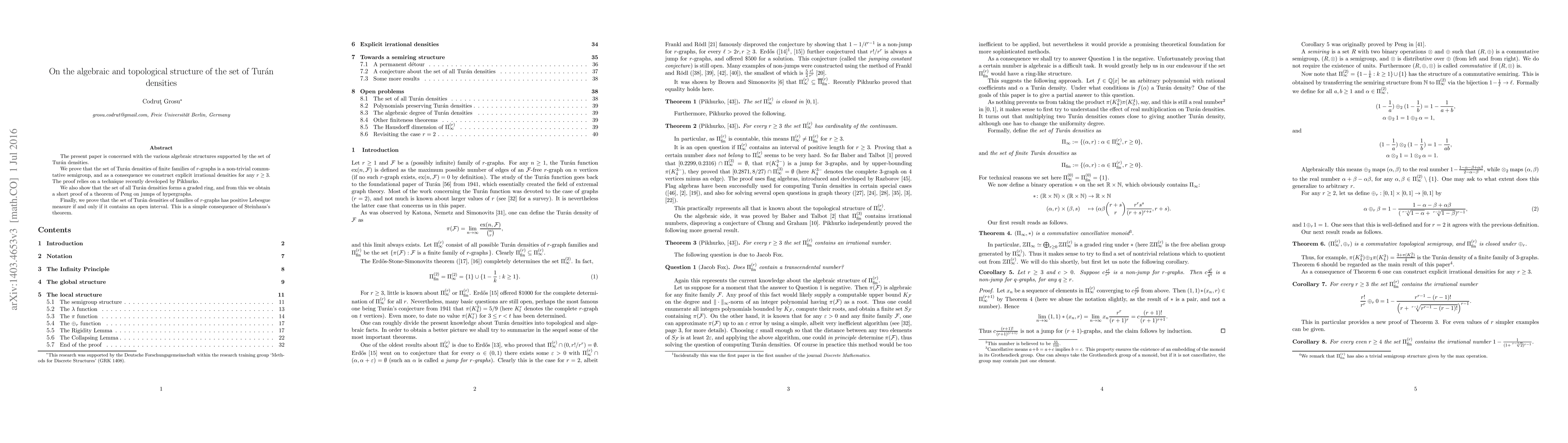This paper explores the algebraic and topological structures of the set of Turán densities, proving it forms a non-trivial commutative semigroup and a graded ring, and demonstrating its positive Lebesgue measure under specific conditions. It also provides explicit irrational densities and a short proof of Peng's theorem on hypergraph jumps.