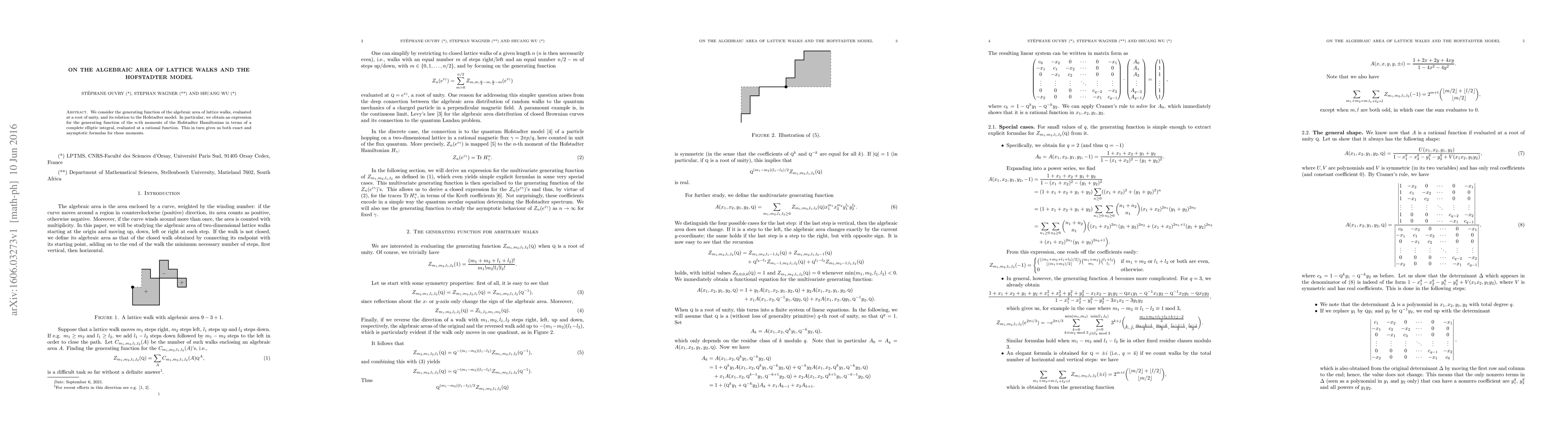 This paper explores the algebraic area of lattice walks and connects it to the Hofstadter model, deriving an expression for the generating function of the n-th moments using a complete elliptic integral, which provides exact and asymptotic formulas for these moments.