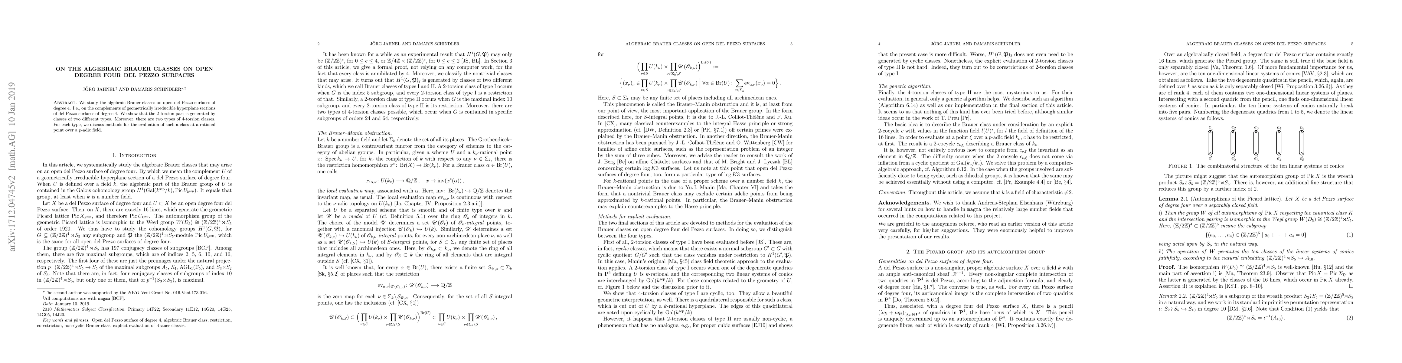 This paper studies algebraic Brauer classes on open degree four del Pezzo surfaces, revealing two types of 2-torsion classes and two types of 4-torsion classes that can be evaluated at rational points over p-adic fields.