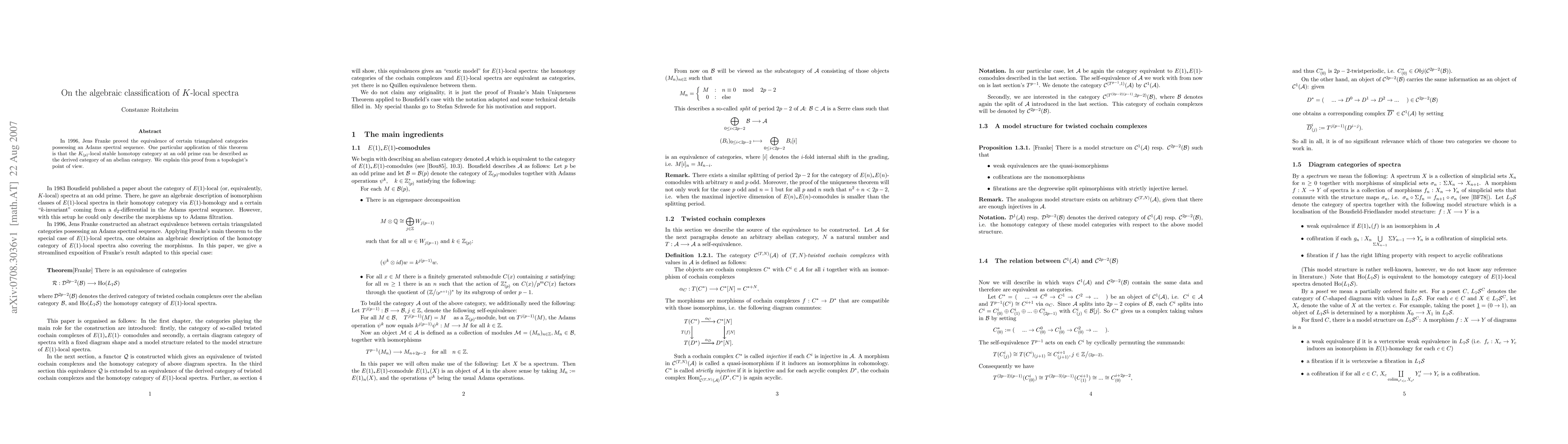 In 1996, Jens Franke proved the equivalence of certain triangulated categories possessing an Adams spectral sequence. One particular application of this theorem is that the K_(p)-local stable homotopy category at an odd prime can be described as the derived category of an abelian category. We explain this proof from a topologist's point of view.