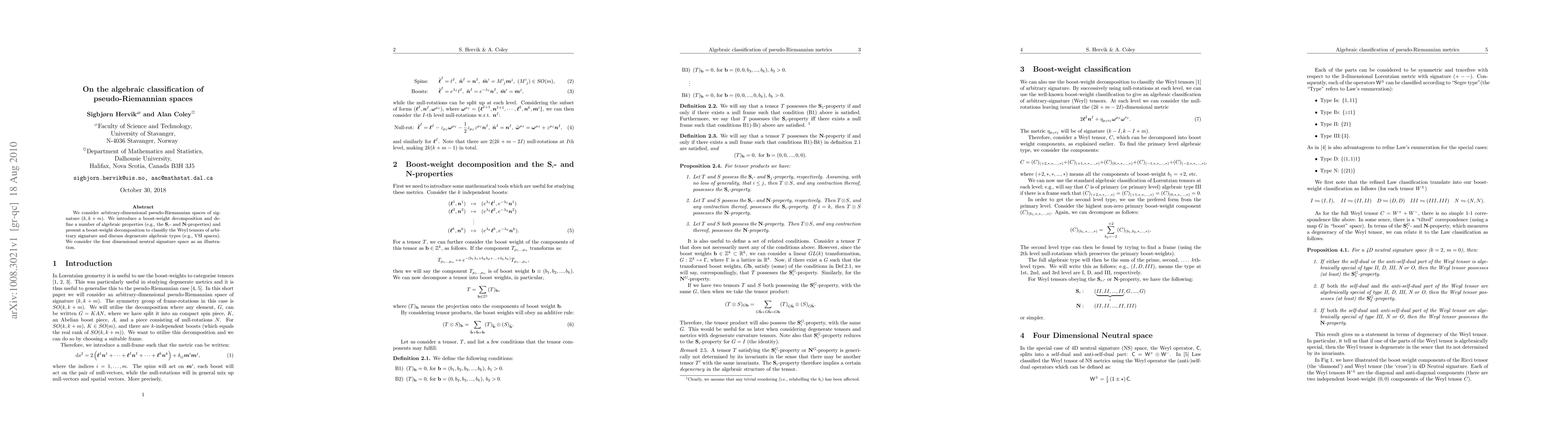 We consider arbitrary-dimensional pseudo-Riemannian spaces of signature $(k,k+m)$. We introduce a boost-weight decomposition and define a number of algebraic properties (e.g., the ${\bf S}_i$- and ${\bf N}$-properties) and present a boost-weight decomposition to classify the Weyl tensors of arbitrary signature and discuss degenerate algebraic types (e.g., VSI spaces). We consider the four dimensional neutral signature space as an illustration.
