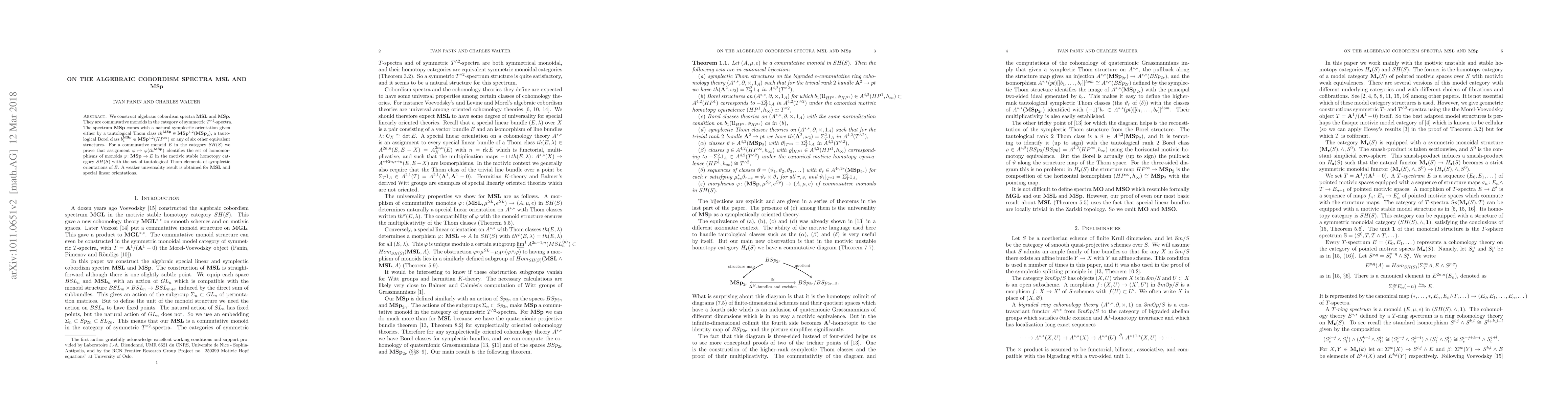 This paper constructs algebraic cobordism spectra MSL and MSp, demonstrating their roles as commutative monoids in symmetric T^{2}- spectra. MSp is shown to have a natural symplectic orientation and is used to identify homomorphisms of monoids in the motivic stable homotopy category.