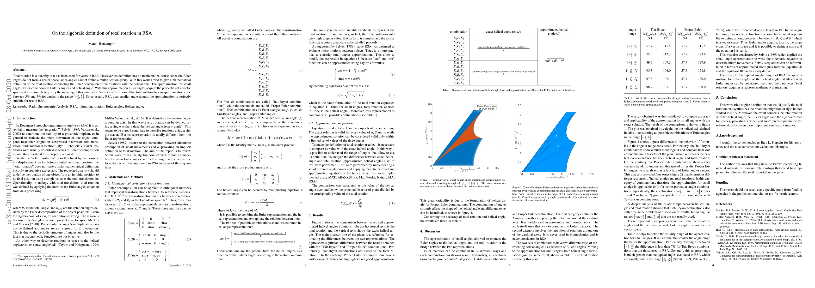 Total rotation is a quantity that has been used for years in RSA. However, its definition has no mathematical sense, since the Euler angles do not form a vector space, since angles cannot define a multiplication group. With this work I tried to give a mathematical definition of the total rotation connecting the Euler description of the rotations with the helical axis. The approximation for small angles was used to connect Euler's angles and helical angle. With this approximation Euler angles acquire the properties of a vector space and it is possible to justify the meaning of this parameter. Validation test showed that total rotation has an approximation error between 5\% and 7\% for angles in the range $\left[-\frac{\pi}{6}, \frac{\pi}{6} \right]$. Since usually RSA uses smaller angle ranges, the approximation is perfectly suitable for use in RSA.