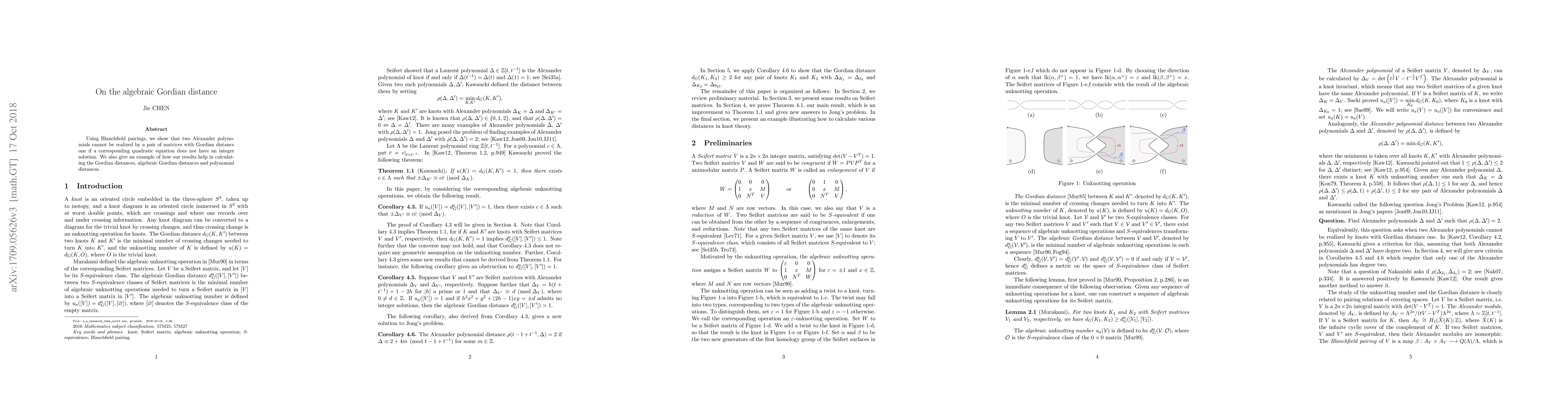 This paper demonstrates that the algebraic Gordian distance cannot be one if the associated quadratic equation lacks integer solutions, leveraging Blanchfield pairings. It provides an illustrative example of the application of these findings in calculating Gordian distances and polynomial distances.