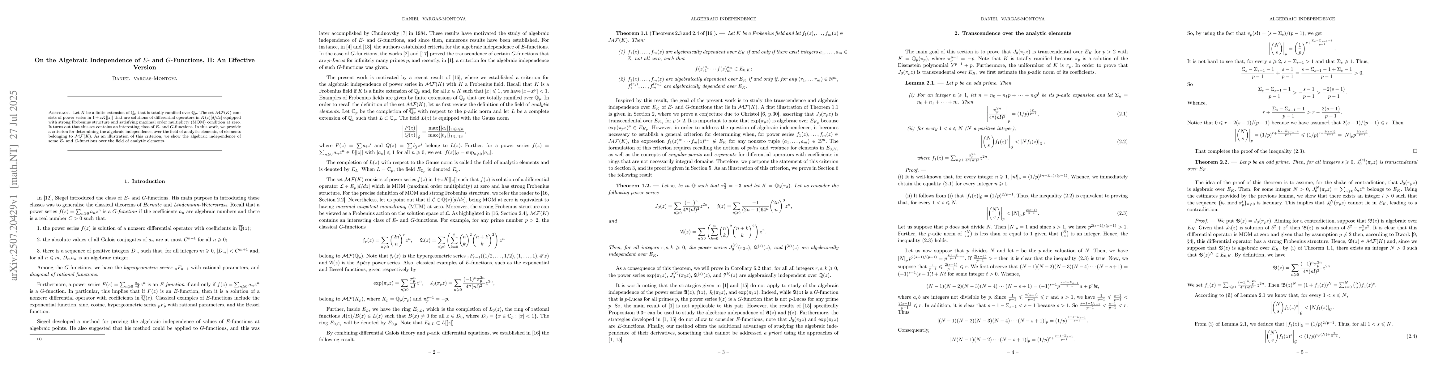 Let $K$ be a finite extension of $\mathbb{Q}_p$ that is totally ramified over $\mathbb{Q}_p$. The set $\mathcal{M}\mathcal{F}(K)$ consists of power series in $1+zK[[z]]$ that are solutions of differential operators in $K(z)[d/dz]$ equipped with strong Frobenius structure and satisfying maximal order multiplicty (MOM) condition at zero. It turns out that this set contains an interesting class of $E$- and $G$-functions. In this work, we provide a criterion for determining the algebraic independence, over the field of analytic elements, of elements belonging to $\mathcal{M}\mathcal{F}(K)$. As an illustration of this criterion, we show the algebraic independence of some $E$- and $G$-functions over the field of analytic elements.