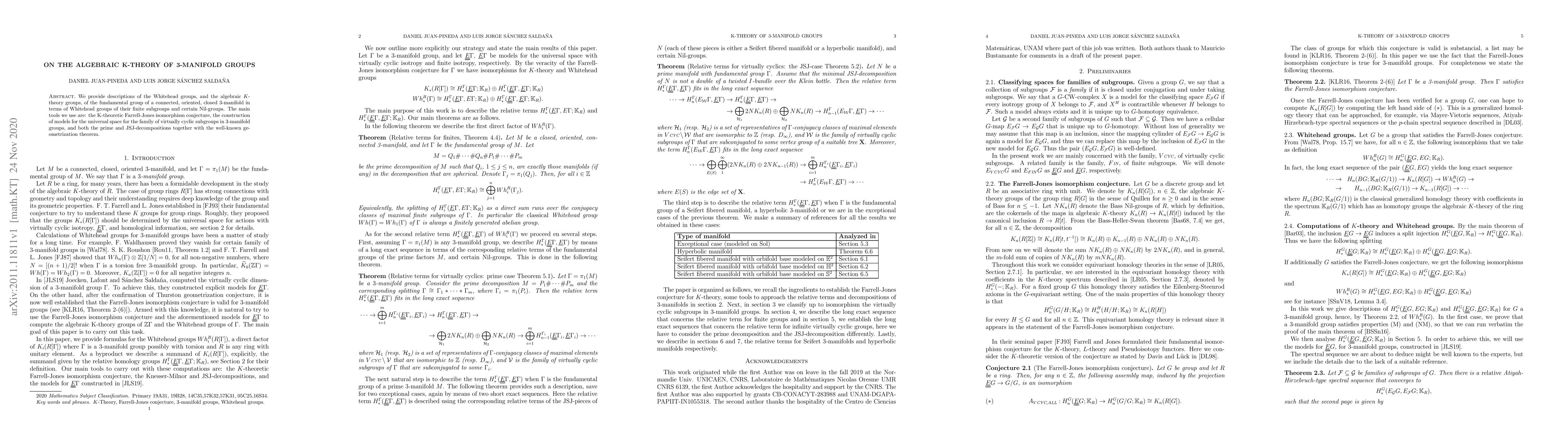 This paper describes the algebraic K-theory groups of 3-manifold groups using the K-theoretic Farrell-Jones isomorphism conjecture and models for virtually cyclic subgroups, linking them to Whitehead groups of their finite subgroups and Nil-groups. The prime and JSJ-decompositions are also utilized alongside the geometrization theorem.