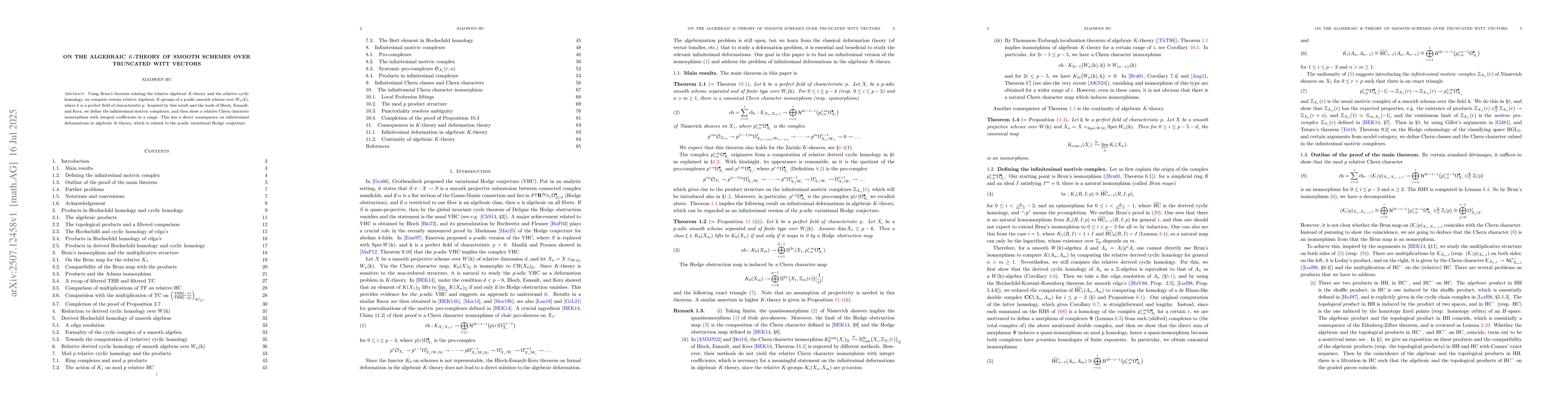 Using Brun's theorem relating the relative algebraic $K$-theory and the relative cyclic homology, we compute certain relative algebraic $K$-groups of a $p$-adic smooth scheme over $W_n(k)$, where $k$ is a perfect field of characteristic $p$. Inspired by this result and the work of Bloch, Esnault, and Kerz, we define the infinitesimal motivic complexes, and then show a relative Chern character isomorphism with integral coefficients in a range. This has a direct consequence on infinitesimal deformations in algebraic $K$-theory, which is related to the $p$-adic variational Hodge conjecture.