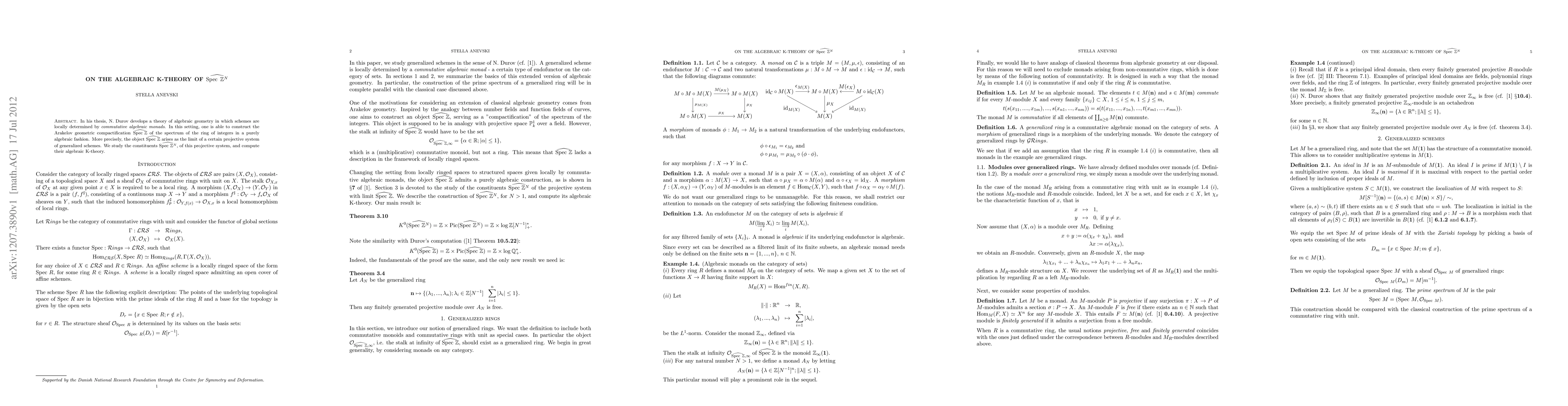 In his thesis, N. Durov develops a theory of algebraic geometry in which schemes are locally determined by commutative algebraic monads. In this setting, one is able to construct the Arakelov geometric compactification of the spectrum of the ring of integers in a purely algebraic fashion. This object arises as the limit of a certain projective system of generalized schemes. We study the constituents of this projective system, and compute their algebraic K-theory.