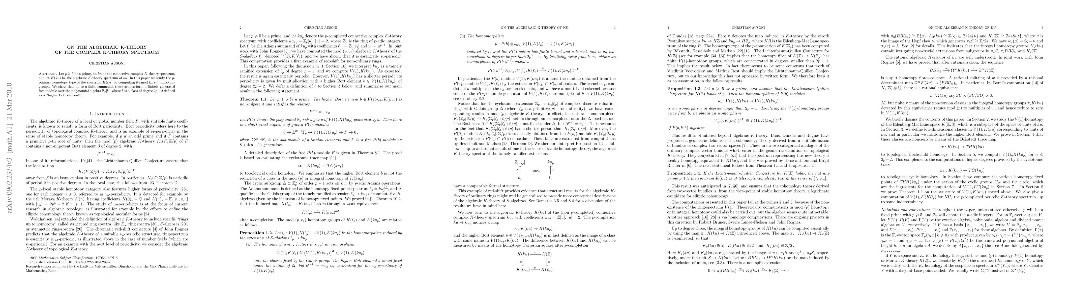 This paper investigates the p-primary homotopy type of the algebraic K-theory spectrum K(ku) of the connective complex K-theory spectrum ku, revealing that its mod (p,v_1) homotopy groups form a finitely generated free module over F_p[b], where b is a higher Bott element of degree 2p+2.