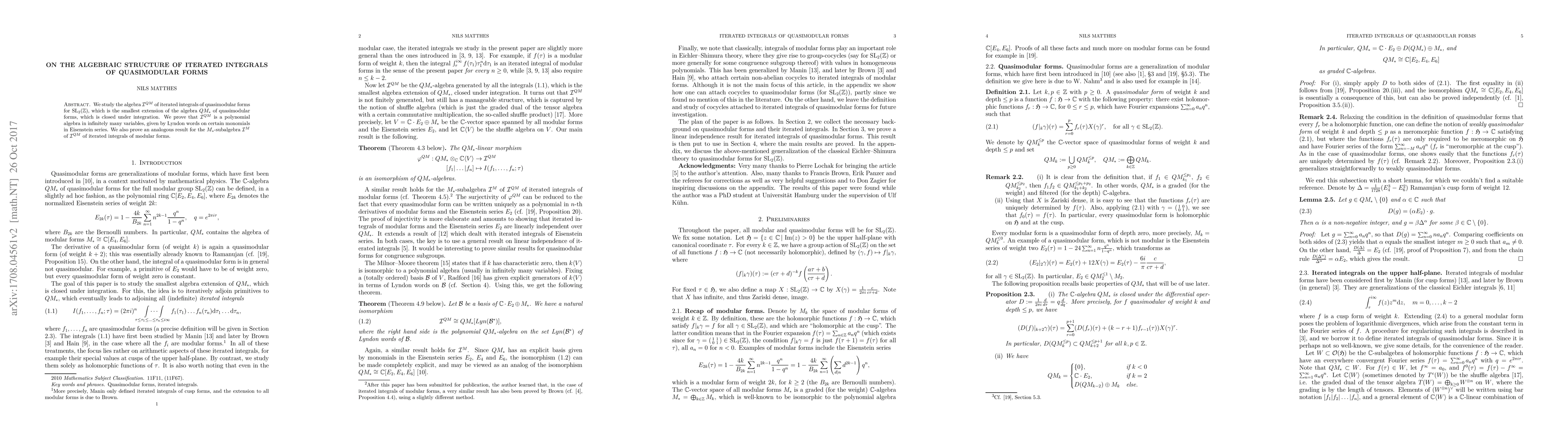 We study the algebra $\mathcal{I}^{QM}$ of iterated integrals of quasimodular forms for $\operatorname{SL}_2(\mathbb{Z})$, which is the smallest extension of the algebra $QM_{\ast}$ of quasimodular forms, which is closed under integration. We prove that $\mathcal{I}^{QM}$ is a polynomial algebra in infinitely many variables, given by Lyndon words on certain monomials in Eisenstein series. We also prove an analogous result for the $M_{\ast}$-subalgebra $\mathcal{I}^{M}$ of $\mathcal{I}^{QM}$ of iterated integrals of modular forms.