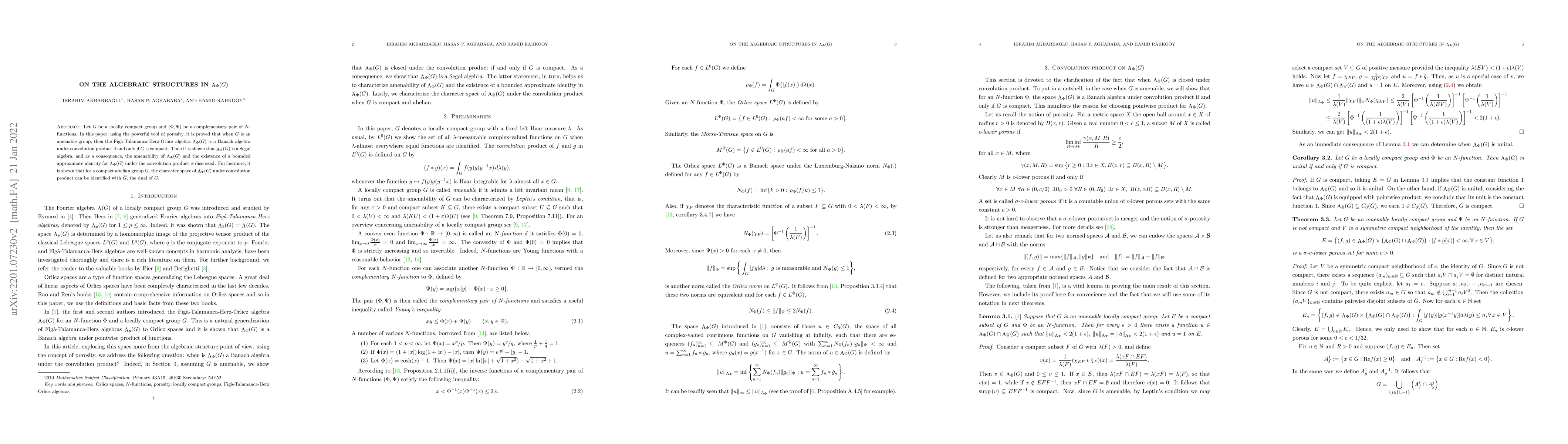 Let $G$ be a locally compact group and $(\Phi, \Psi)$ be a complementary pair of $N$-functions. In this paper, using the powerful tool of porosity, it is proved that when $G$ is an amenable group, then the Fig\`a-Talamanca-Herz-Orlicz algebra ${\A}_{\Phi}(G)$ is a Banach algebra under convolution product if and only if $G$ is compact. Then it is shown that ${\A}_{\Phi}(G)$ is a Segal algebra, and as a consequence, the amenability of ${\A}_{\Phi}(G)$ and the existence of a bounded approximate identity for ${\A}_{\Phi}(G)$ under the convolution product is discussed. Furthermore, it is shown that for a compact abelian group $G$, the character space of ${\A}_{\Phi}(G)$ under convolution product can be identified with $\widehat{G}$, the dual of $G$.