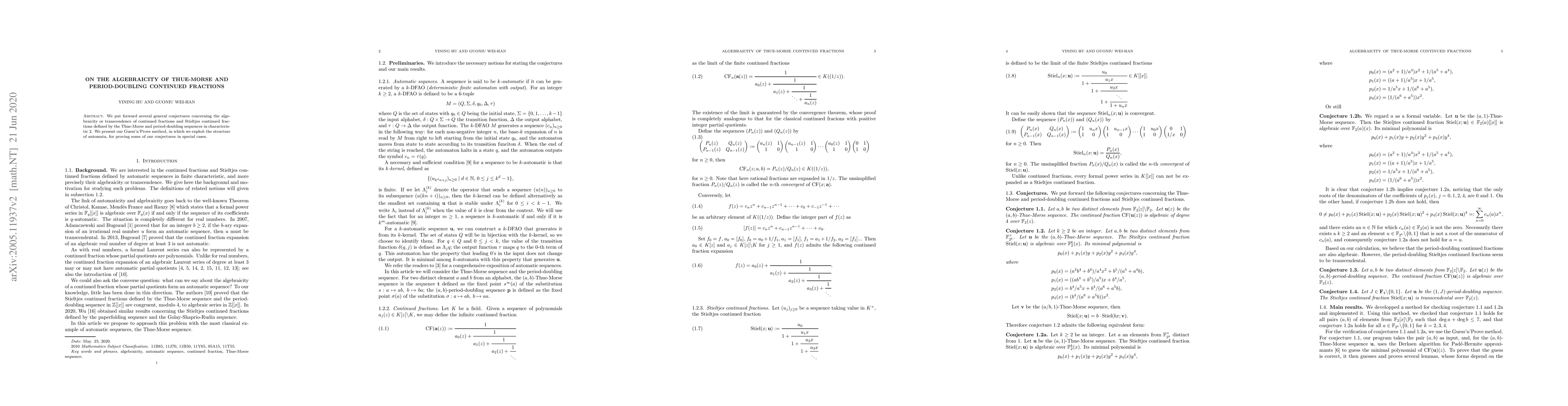 This paper proposes conjectures about the algebraicity or transcendence of continued fractions generated by Thue-Morse and period-doubling sequences in characteristic 2, and introduces a Guess'n'Prove method using automata structure to validate some of these conjectures in specific scenarios.