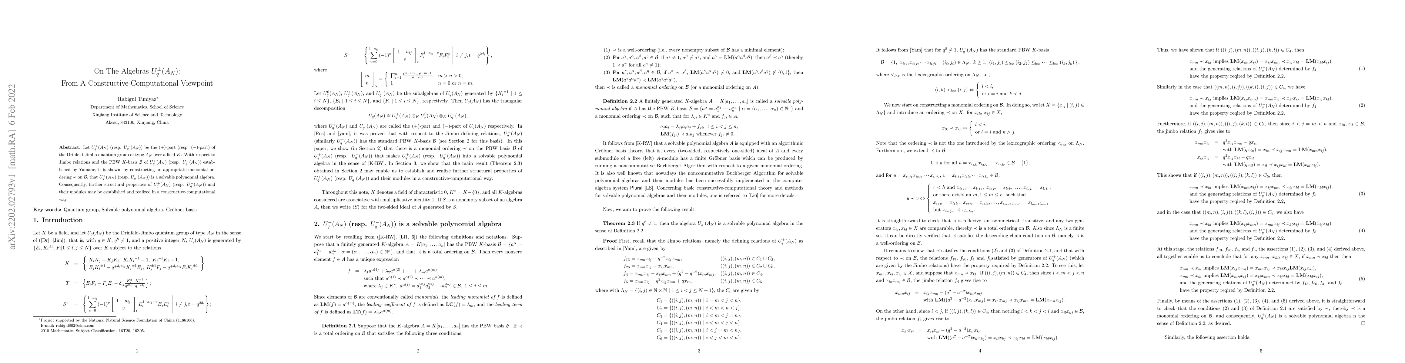 Let $U_q^+(A_N)$ (resp. $U_q^-(A_N)$) be the $(+)$-part (resp. $(-)$-part) of the Drinfeld-Jimbo quantum group of type $A_N$ over a field $K$. With respect to Jimbo relations and the PBW $K$-basis ${\cal B}$ of $U_q^+(A_N)$ (resp. $U_q^-(A_N)$) established by Yamane, it is shown, by constructing an appropriate monomial ordering $\prec$ on ${\cal B}$, that $U_q^+(A_N)$ (resp. $U_q^-(A_N)$) is a solvable polynomial algebra. Consequently, further structural properties of $U_q^+(A_N)$ (resp. $U_q^-(A_N)$) and their modules may be established and realized in a constructive-computational way.