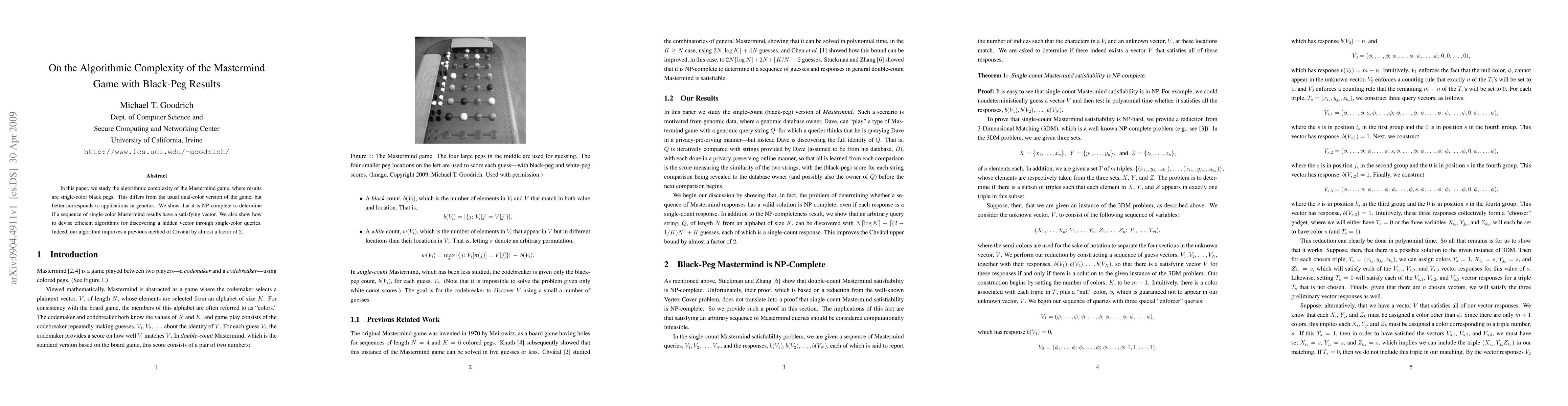 The Mastermind game with black-peg has been shown to be NP-complete, but efficient algorithms have been devised for finding a hidden vector through single-color queries, improving previous methods by almost a factor of 2.