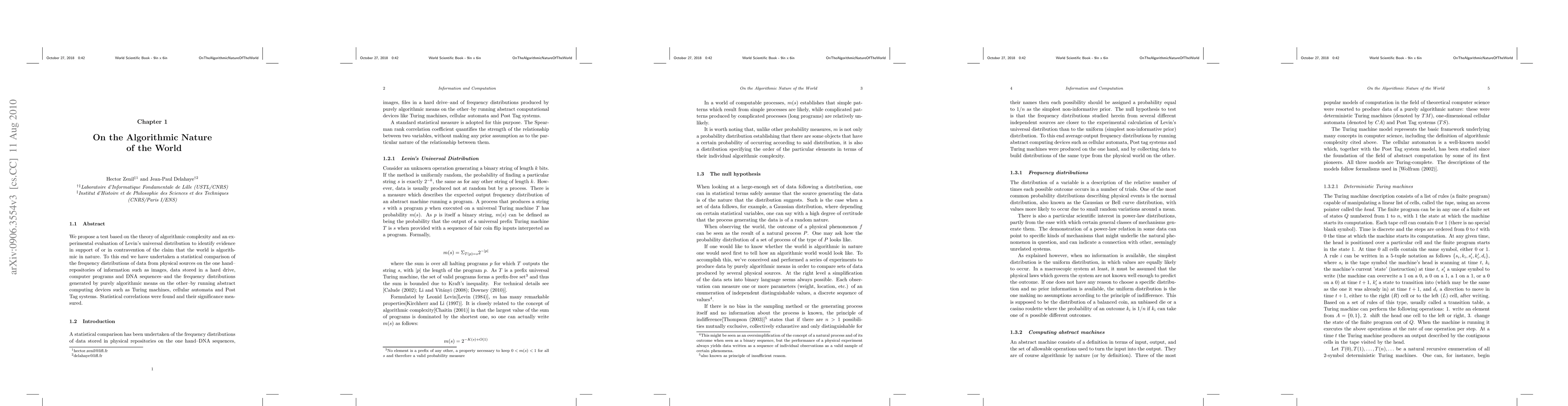 We propose a test based on the theory of algorithmic complexity and an experimental evaluation of Levin's universal distribution to identify evidence in support of or in contravention of the claim that the world is algorithmic in nature. To this end we have undertaken a statistical comparison of the frequency distributions of data from physical sources on the one hand--repositories of information such as images, data stored in a hard drive, computer programs and DNA sequences--and the frequency distributions generated by purely algorithmic means on the other--by running abstract computing devices such as Turing machines, cellular automata and Post Tag systems. Statistical correlations were found and their significance measured.