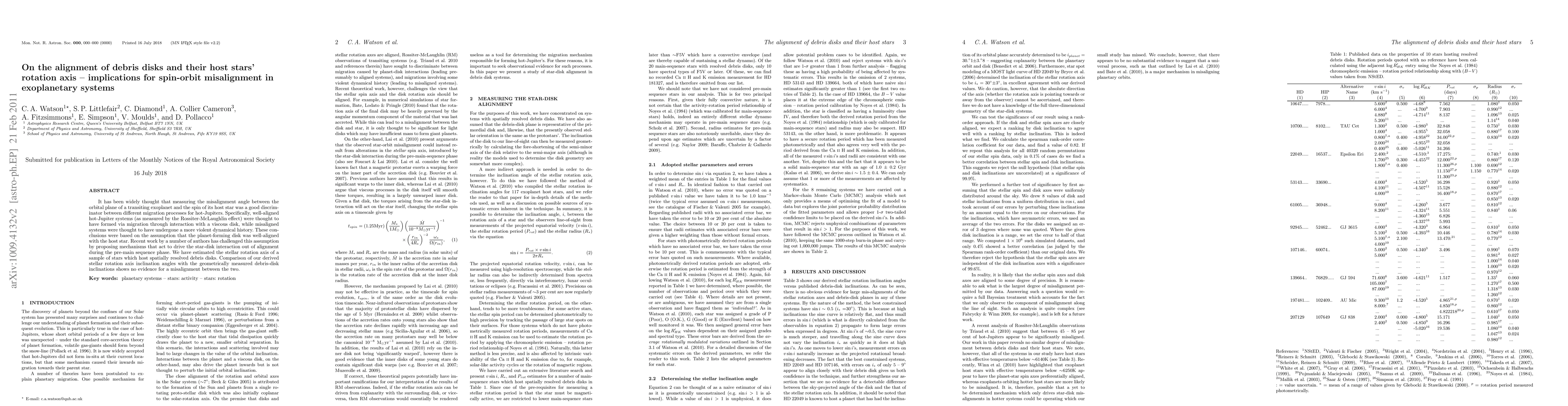 It has been widely thought that measuring the misalignment angle between the orbital plane of a transiting exoplanet and the spin of its host star was a good discriminator between different migration processes for hot-Jupiters. Specifically, well-aligned hot-Jupiter systems (as measured by the Rossiter-McLaughlin effect) were thought to have formed via migration through interaction with a viscous disk, while misaligned systems were thought to have undergone a more violent dynamical history. These conclusions were based on the assumption that the planet-forming disk was well-aligned with the host star. Recent work by a number of authors has challenged this assumption by proposing mechanisms that act to drive the star-disk interaction out of alignment during the pre-main sequence phase. We have estimated the stellar rotation axis of a sample of stars which host spatially resolved debris disks. Comparison of our derived stellar rotation axis inclination angles with the geometrically measured debris-disk inclinations shows no evidence for a misalignment between the two.