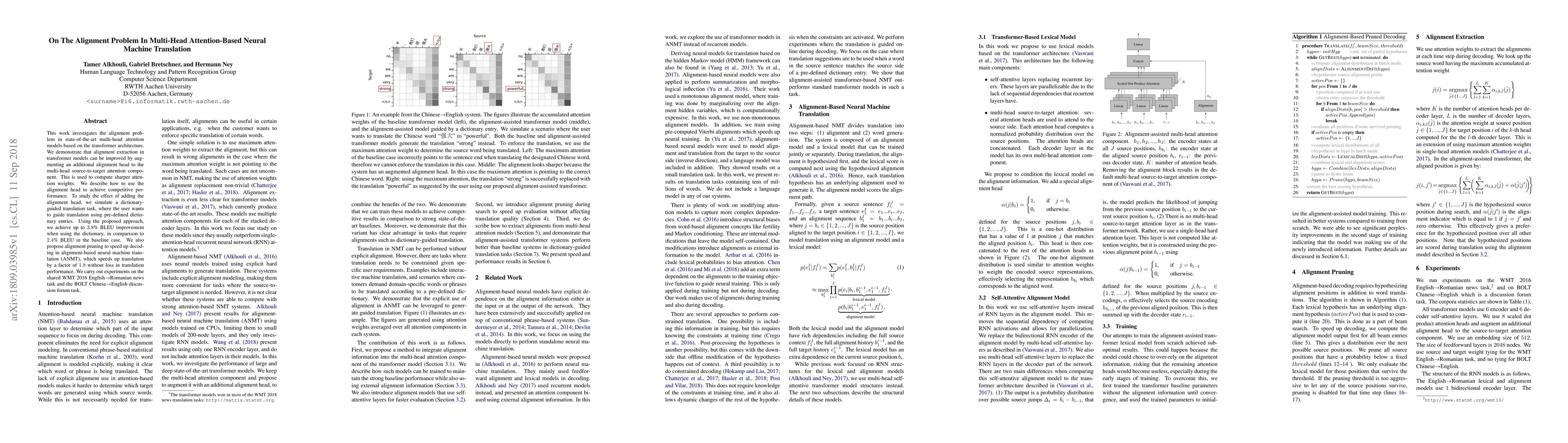 This work investigates the alignment problem in state-of-the-art multi-head attention models based on the transformer architecture. We demonstrate that alignment extraction in transformer models can be improved by augmenting an additional alignment head to the multi-head source-to-target attention component. This is used to compute sharper attention weights. We describe how to use the alignment head to achieve competitive performance. To study the effect of adding the alignment head, we simulate a dictionary-guided translation task, where the user wants to guide translation using pre-defined dictionary entries. Using the proposed approach, we achieve up to $3.8$ % BLEU improvement when using the dictionary, in comparison to $2.4$ % BLEU in the baseline case. We also propose alignment pruning to speed up decoding in alignment-based neural machine translation (ANMT), which speeds up translation by a factor of $1.8$ without loss in translation performance. We carry out experiments on the shared WMT 2016 English$\to$Romanian news task and the BOLT Chinese$\to$English discussion forum task.