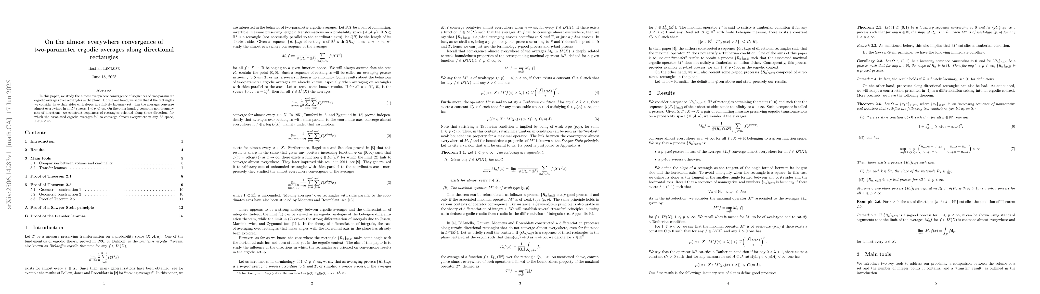 In this paper, we study the almost everywhere convergence of sequences of two-parameter ergodic averages over rectangles in the plane. On the one hand, we show that if the rectangles we consider have their sides with slopes in a finitely lacunary set, then the averages converge almost everywhere in all $L^p$ spaces, $1 < p \leq \infty$. On the other hand, given some non-lacunary sets of directions, we construct sequences of rectangles oriented along these directions for which the associated ergodic averages fail to converge almost everywhere in any $L^p$ space, $1 < p < \infty$.