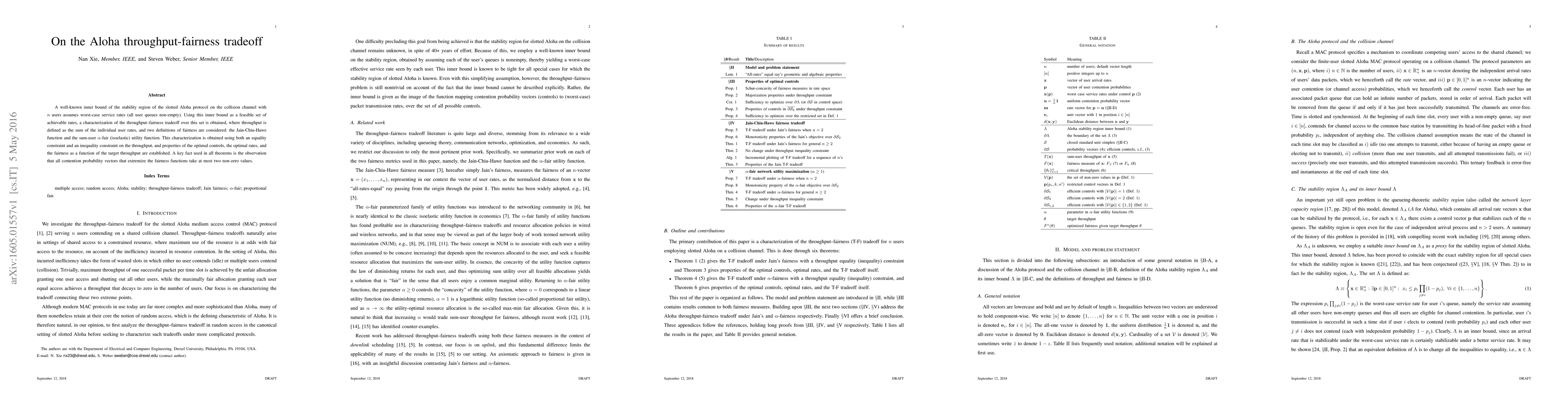 The paper analyzes the tradeoff between throughput and fairness in the Aloha protocol, finding that a key constraint on contention probability vectors leads to at most two non-zero values, limiting the achievable rates.