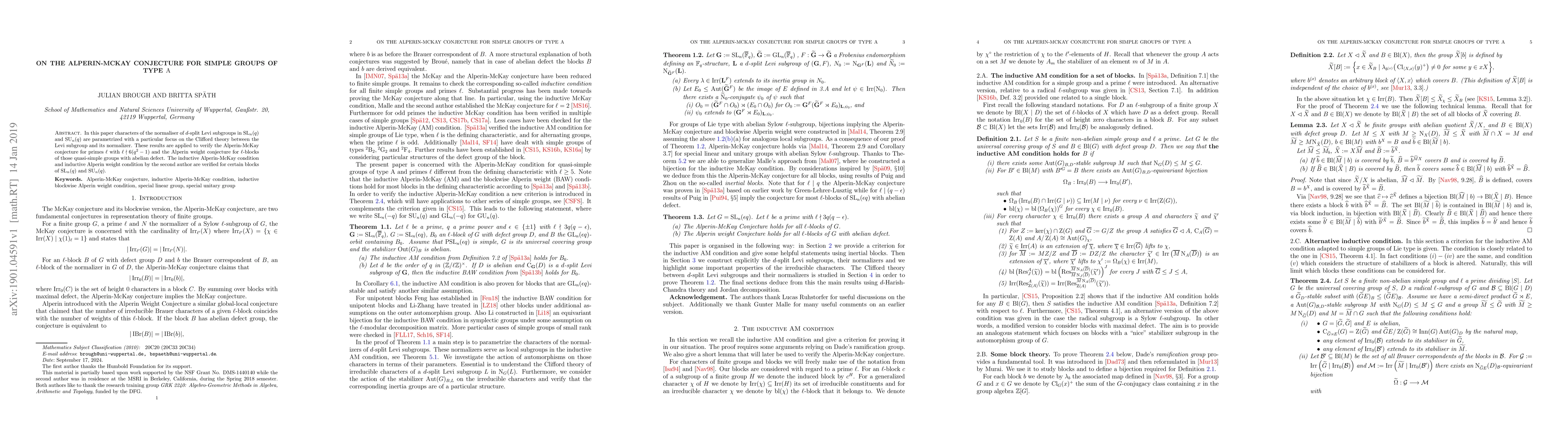 This paper details the parametrization of characters of normalizers of $d$-split Levi subgroups in $\mathrm{SL}_n(q)$ and $\mathrm{SU}_n(q)$, focusing on Clifford theory. It verifies the Alperin-McKay conjecture for primes not dividing $6(q^2-1)$ and the Alperin weight conjecture for certain quasi-simple groups, confirming the inductive conditions for specific blocks.