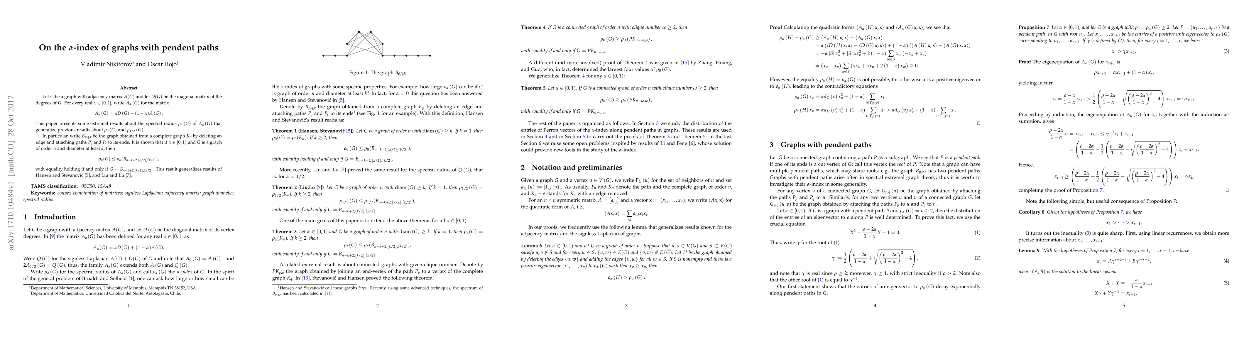Let $G$ be a graph with adjacency matrix $A(G)$ and let $D(G)$ be the diagonal matrix of the degrees of $G$. For every real $\alpha\in\left[ 0,1\right] $, write $A_{\alpha}\left( G\right) $ for the matrix \[ A_{\alpha}\left( G\right) =\alpha D\left( G\right) +(1-\alpha)A\left( G\right) . \] This paper presents some extremal results about the spectral radius $\rho_{\alpha}\left( G\right) $ of $A_{\alpha}\left( G\right) $ that generalize previous results about $\rho_{0}\left( G\right) $ and $\rho _{1/2}\left( G\right) $. In particular, write $B_{p,q,r}$ be the graph obtained from a complete graph $K_{p}$ by deleting an edge and attaching paths $P_{q}$ and $P_{r}$ to its ends. It is shown that if $\alpha\in\left[ 0,1\right) $ and $G$ is a graph of order $n$ and diameter at least $k,$ then% \[ \rho_{\alpha}(G)\leq\rho_{\alpha}(B_{n-k+2,\lfloor k/2\rfloor,\lceil k/2\rceil}), \] with equality holding if and only if $G=B_{n-k+2,\lfloor k/2\rfloor,\lceil k/2\rceil}$. This result generalizes results of Hansen and Stevanovi\'{c} \cite{HaSt08}, and Liu and Lu \cite{LiLu14}.