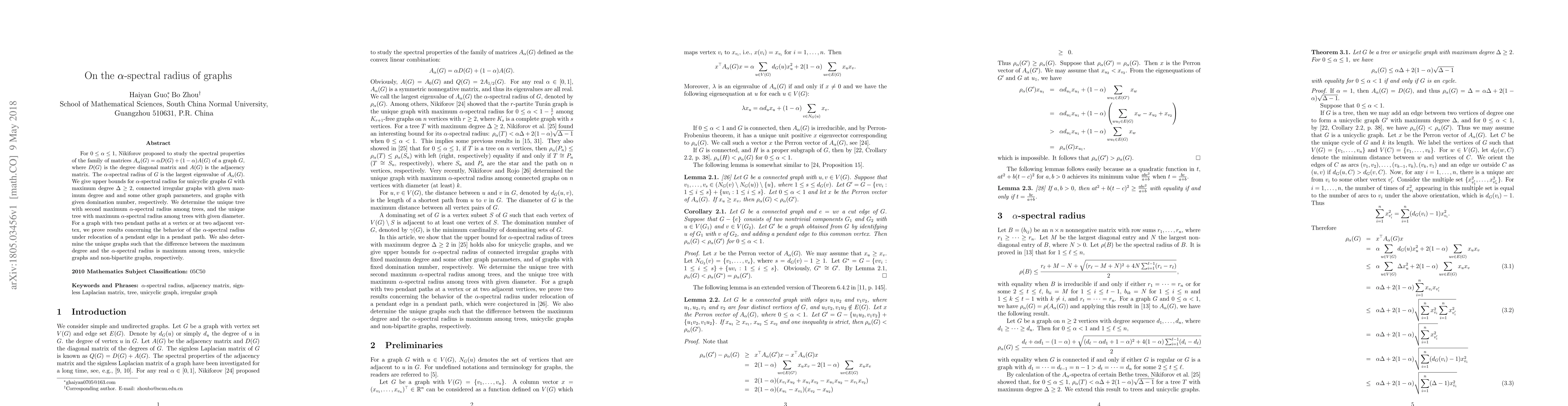 For $0\le \alpha\le 1$, Nikiforov proposed to study the spectral properties of the family of matrices $A_{\alpha}(G)=\alpha D(G)+(1-\alpha)A(G)$ of a graph $G$, where $D(G)$ is the degree diagonal matrix and $A(G)$ is the adjacency matrix. The $\alpha$-spectral radius of $G$ is the largest eigenvalue of $A_{\alpha}(G)$. We give upper bounds for $\alpha$-spectral radius for unicyclic graphs $G$ with maximum degree $\Delta\ge 2$, connected irregular graphs with given maximum degree and and some other graph parameters, and graphs with given domination number, respectively. We determine the unique tree with second maximum $\alpha$-spectral radius among trees, and the unique tree with maximum $\alpha$-spectral radius among trees with given diameter. For a graph with two pendant paths at a vertex or at two adjacent vertex, we prove results concerning the behavior of the $\alpha$-spectral radius under relocation of a pendant edge in a pendant path. We also determine the unique graphs such that the difference between the maximum degree and the $\alpha$-spectral radius is maximum among trees, unicyclic graphs and non-bipartite graphs, respectively.