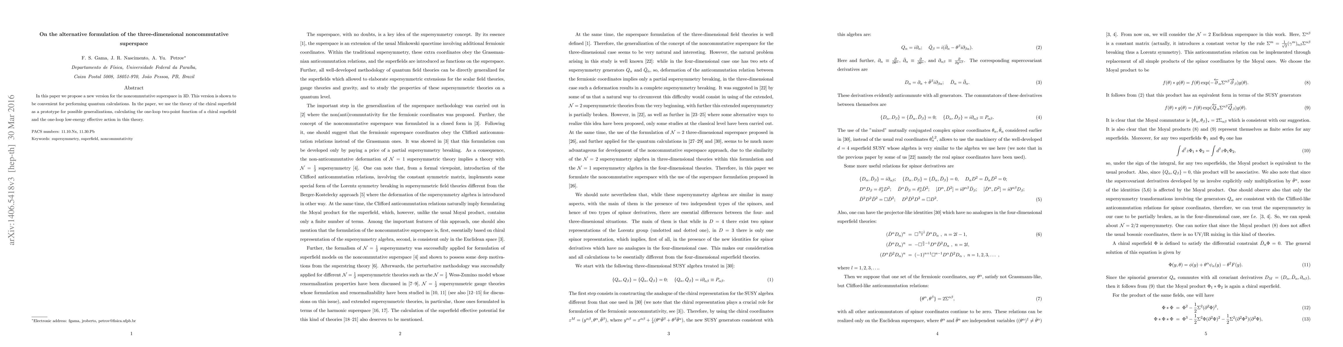 In this paper we propose a new version for the noncommutative superspace in 3D. This version is shown to be convenient for performing quantum calculations. In the paper, we use the theory of the chiral superfield as a prototype for possible generalizations, calculating the one-loop two-point function of a chiral supefield and the one-loop low-energy effective action in this theory.