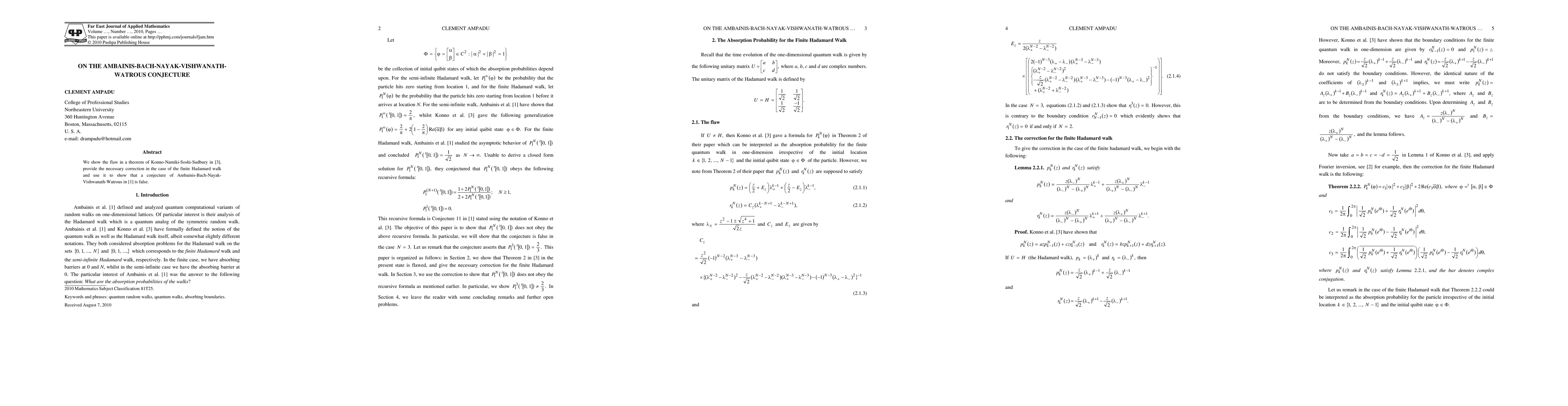 We show the flaw in a theorem of Konno, Namiki, Soshi, and Sudbury in [3] and provide the necessary correction in the case of the Finite Hadamard walk and use it to show that a conjecture of Ambainis, Bach, Nayak, Vishwanath, and Watrous in [1] is false.
