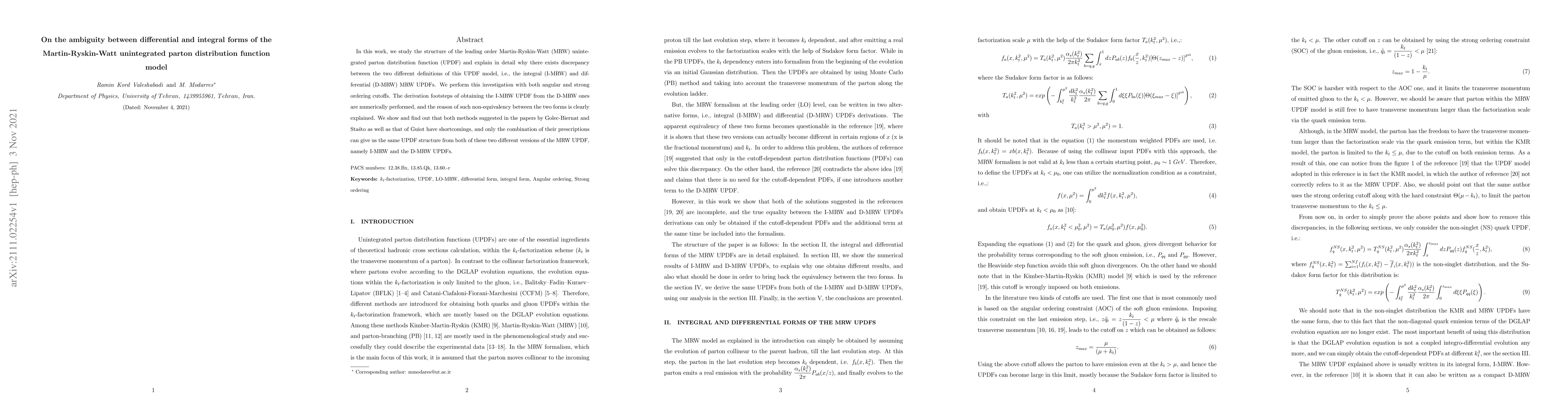In this work, we study the structure of the leading order Martin-Ryskin-Watt (MRW) unintegrated parton distribution function (UPDF) and explain in detail why there exists discrepancy between the two different definitions of this UPDF model, i.e., the integral (I-MRW) and differential (D-MRW) MRW UPDFs. We perform this investigation with both angular and strong ordering cutoffs. The derivation footsteps of obtaining the I-MRW UPDF from the D-MRW ones are numerically performed, and the reason of such non-equivalency between the two forms is clearly explained. We show and find out that both methods suggested in the papers by Golec-Biernat and Stasto as well as that of Guiot have shortcomings, and only the combination of their prescriptions can give us the same UPDF structure from both of these two different versions of the MRW UPDF, namely I-MRW and the D-MRW UPDFs.