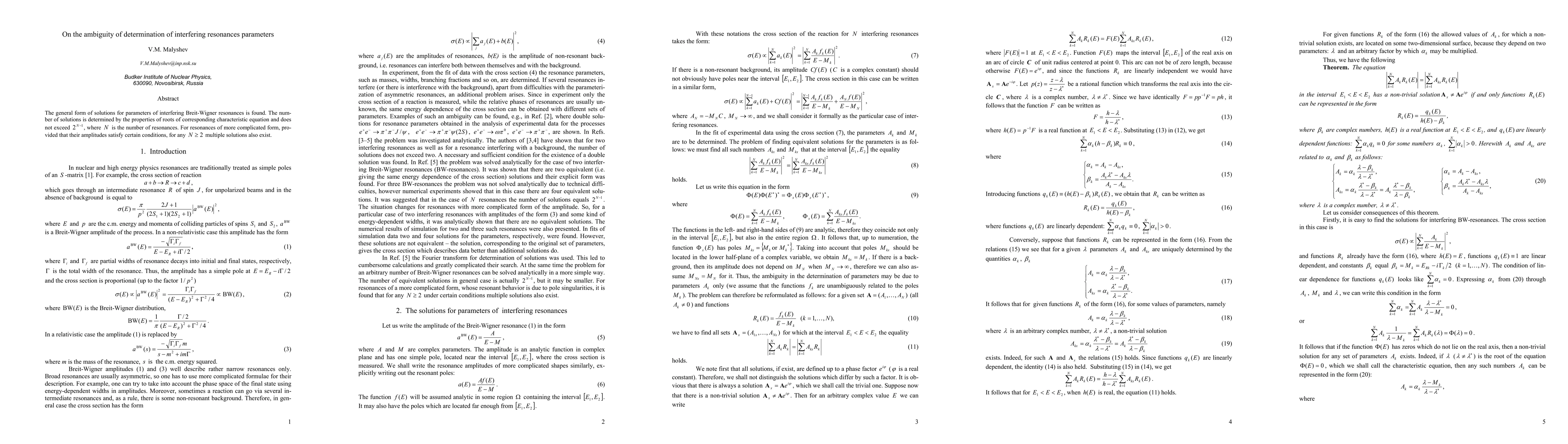Research finds that parameters of interfering Breit-Wigner resonances have multiple solutions, with a maximum of $2^{N-1}$ for each resonance, depending on the roots of their characteristic equation.