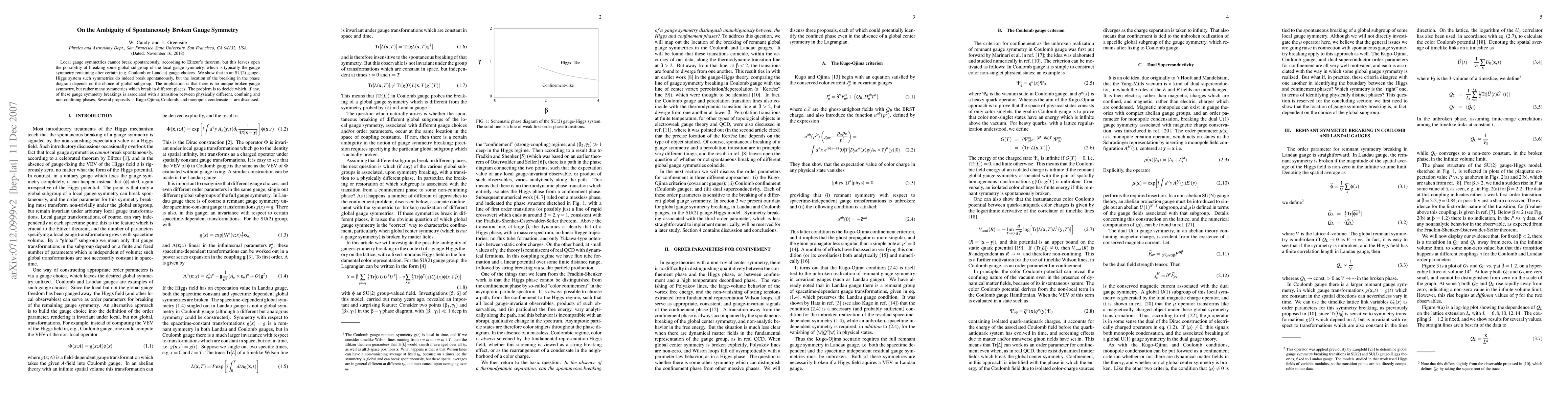 Local gauge symmetries cannot break spontaneously, according to Elitzur's theorem, but this leaves open the possibility of breaking some global subgroup of the local gauge symmetry, which is typically the gauge symmetry remaining after certain (e.g. Coulomb or Landau) gauge choices. We show that in an SU(2) gauge-Higgs system such symmetries do indeed break spontaneously, but the location of the breaking in the phase diagram depends on the choice of global subgroup. The implication is that there is no unique broken gauge symmetry, but rather many symmetries which break in different places. The problem is to decide which, if any, of these gauge symmetry breakings is associated with a transition between physically different, confining and non-confining phases. Several proposals - Kugo-Ojima, Coulomb, and monopole condensate - are discussed.