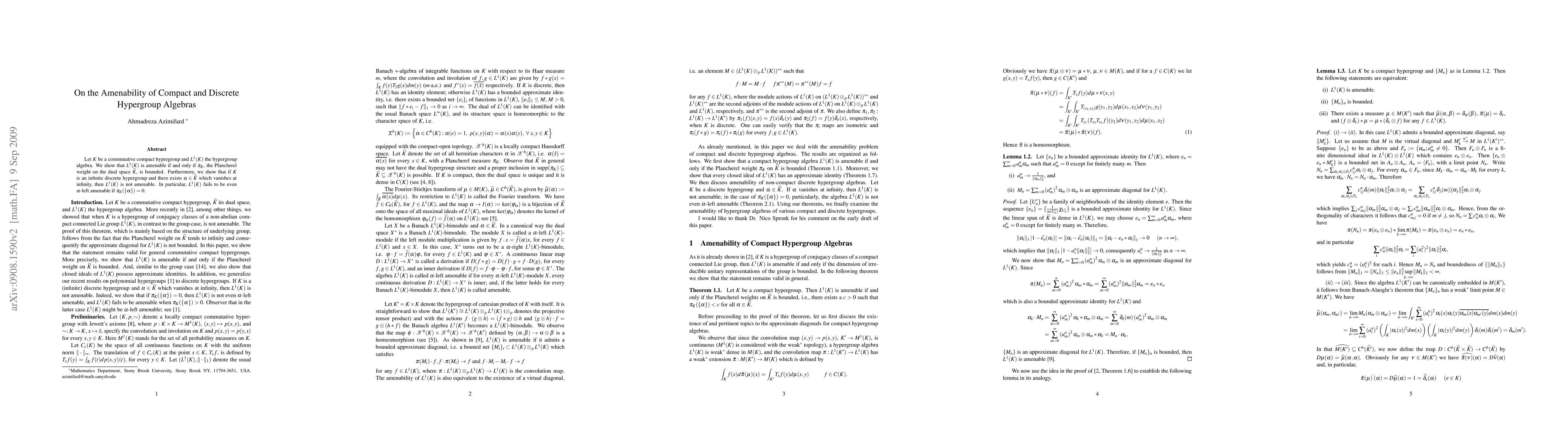 This paper demonstrates that the amenability of the hypergroup algebra $L^1(K)$ for a commutative compact hypergroup $K$ is equivalent to the boundedness of the Plancherel weight $\pi_K$ on its dual space $\widehat{K}$. It also proves that for infinite discrete hypergroups, the absence of amenability arises if there exists a character $\alpha$ vanishing at infinity, particularly when $\pi_K(\{\alpha\})=0$.