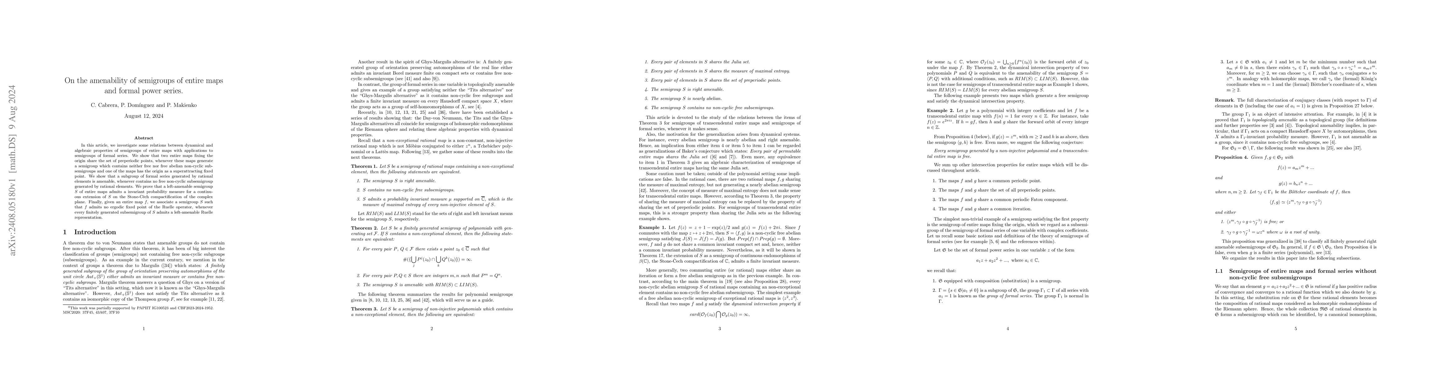 This paper explores the connections between dynamical and algebraic properties of semigroups of entire maps and formal power series. It demonstrates shared preperiodic points for certain entire maps and proves the amenability of subgroups of formal series under specific conditions, while also establishing the existence of invariant measures for left-amenable semigroups of entire maps.