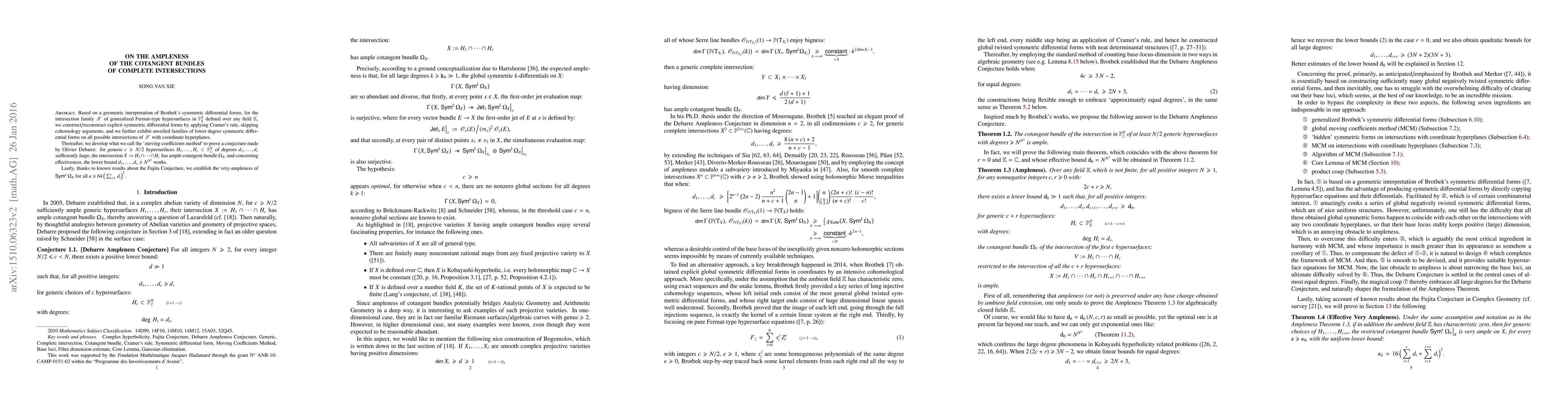 Based on a geometric interpretation of Brotbek's symmetric differential forms, for the intersection family $\mathcal{X}$ of generalized Fermat-type hypersurfaces in $\mathbb{P}_{\mathbb{K}}^N$ defined over any field $\mathbb K$, we reconstruct explicit symmetric differential forms by applying Cramer's rule, skipping cohomology arguments, and we further exhibit unveiled families of lower degree symmetric differential forms on all possible intersections of $\mathcal{X}$ with coordinate hyperplanes. Thereafter, we develop what we call the `moving coefficients method' to prove a conjecture made by Olivier Debarre: for generic $c\geqslant N/2$ hypersurfaces $H_1,\dots,H_c\subset \mathbb{P}_{\mathbb C}^N$ of degrees $d_1,\dots,d_c$ sufficiently large, the intersection $X:=H_1 \cap \cdots \cap H_c $ has ample cotangent bundle $\Omega_X$, and concerning effectiveness, the lower bound $ d_1,\dots,d_c\geqslant N^{N^2} $ works. Lastly, thanks to known results about the Fujita Conjecture, we establish the very-ampleness of $\mathsf{Sym}^{\kappa}\,\Omega_X$ for all $\kappa\geqslant 64\, \Big( \sum_{i=1}^c\, d_i \Big)^2 $.