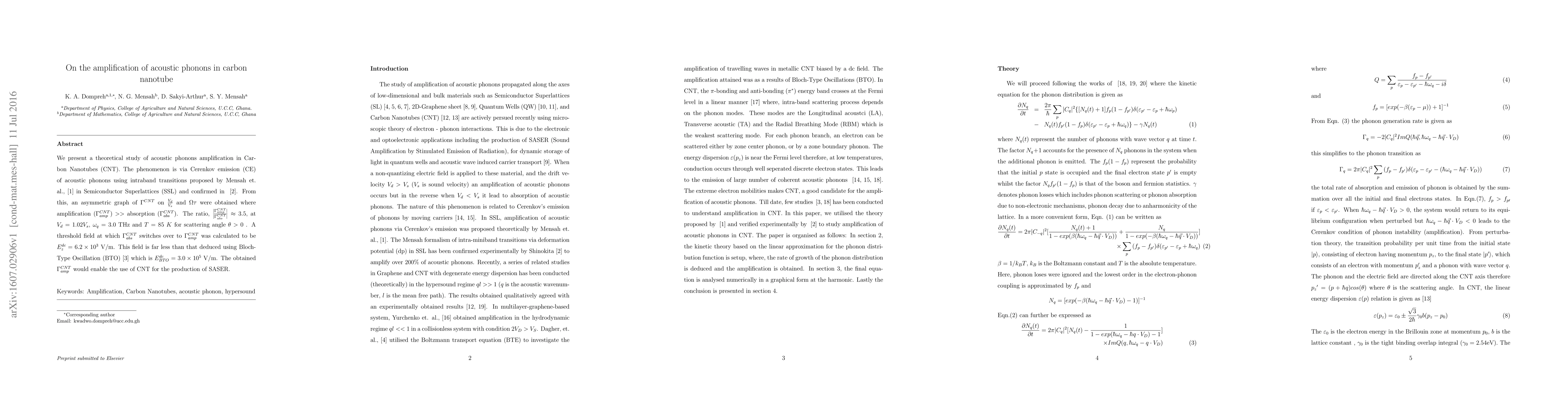 We present a theoretical study of acoustic phonons amplification in Carbon Nanotubes (CNT). The phenomenon is via Cerenkov emission (CE) of acoustic phonons using intraband transitions proposed by Mensah et. al.,~\cite{1} in Semiconductor Superlattices (SSL) and confirmed in ~\cite{2}. From this, an asymmetric graph of $\Gamma^{CNT}$ on $\frac{V_d}{V_s}$ and $\Omega\tau$ were obtained where amplification ($\Gamma_{amp}^{CNT}$) $>>$ absorption ($\Gamma_{abs}^{CNT}$). The ratio, $\frac{\vert \Gamma_{amp}^{CNT}\vert}{\vert\Gamma_{abs}^{CNT}\vert}\approx 3.5$, at $V_d = 1.02V_s$, $\omega_q = 3.0\ \mathrm{THz}$ and $T = 85\ K$ for scattering angle $\theta > 0$ . A threshold field at which $\Gamma_{abs}^{CNT}$ switches over to $\Gamma_{amp}^{CNT}$ was calculated to be $E_{z}^{dc} = 6.2\times 10^3\ \mathrm{V/m}$. This field is far less than that deduced using Bloch-Type Oscillation (BTO)~\cite{3} which is $E_{BTO}^{dc} = 3.0\times 10^5\ \mathrm{V/m}$. The obtained $\Gamma_{amp}^{CNT}$ would enable the use of CNT for the production of SASER.